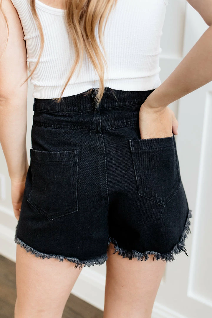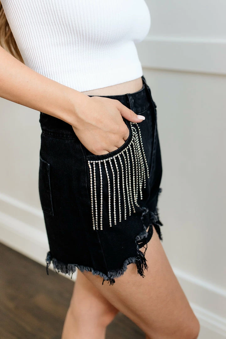 Go to a country concert in the Rhinestone Cowgirl Distressed Denim Shorts in black denim that features a rhinestone tassel trimming.