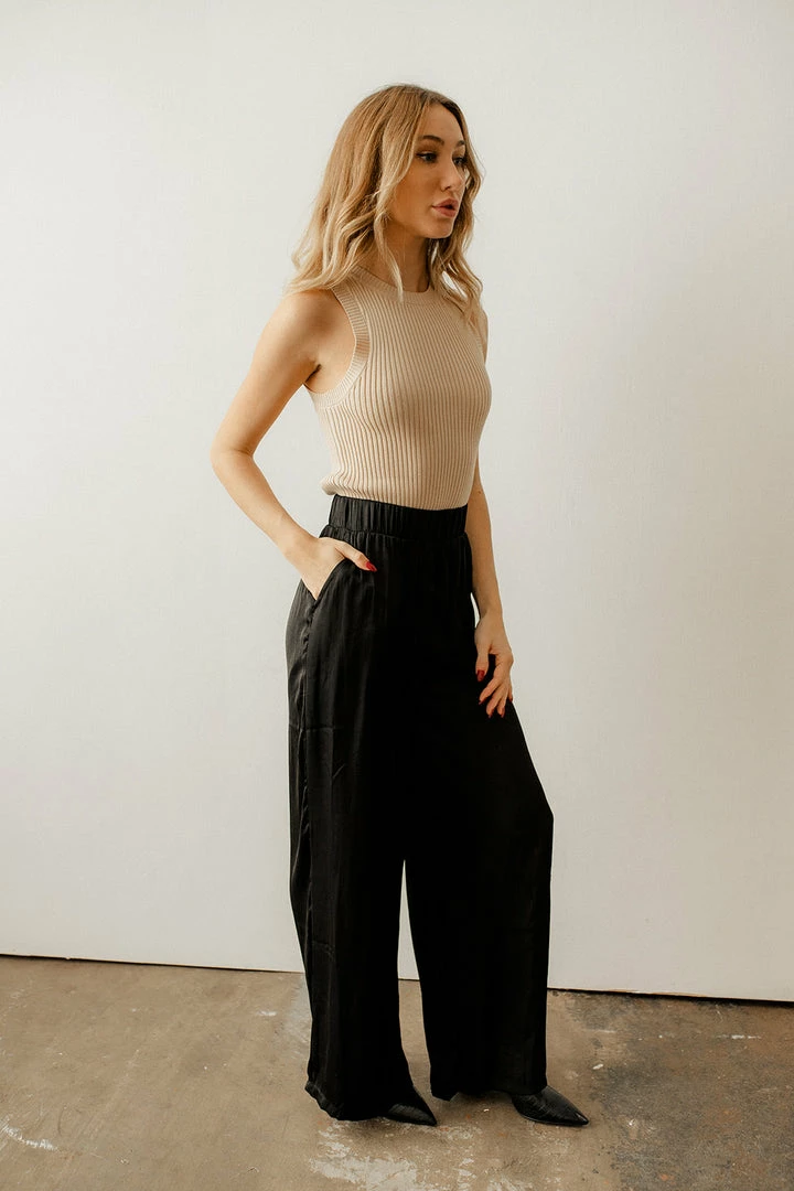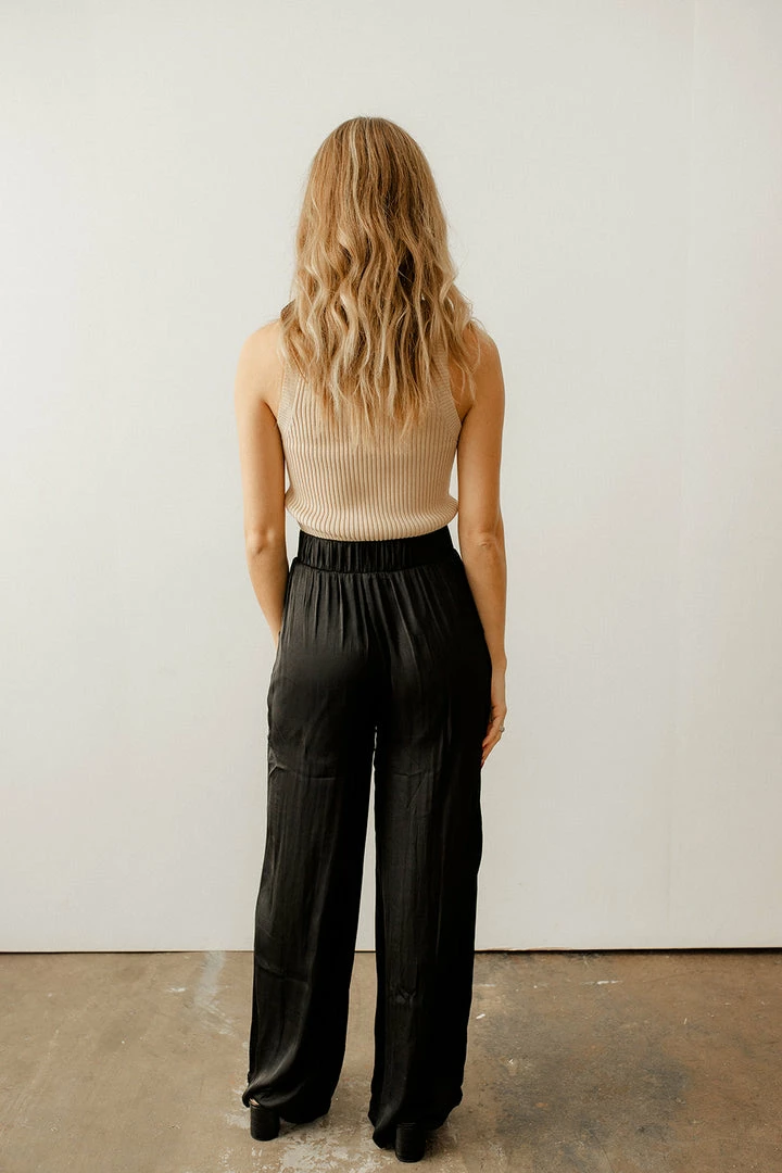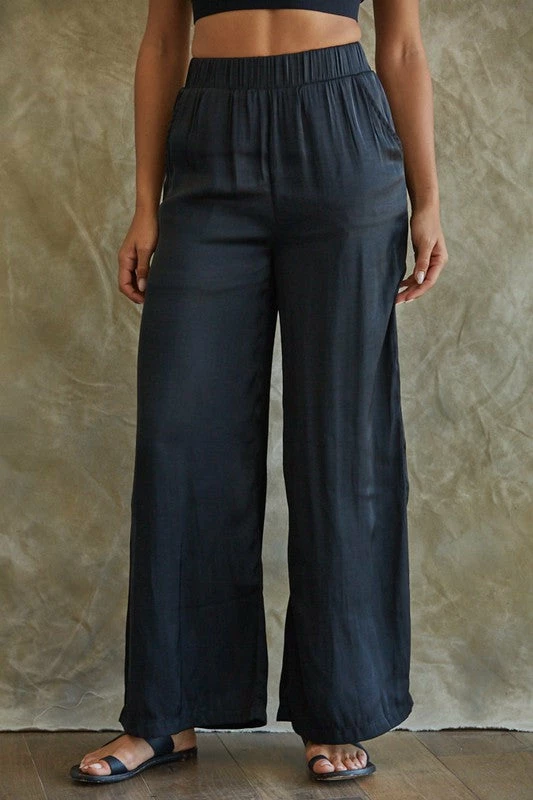 Our Adelle High Rise Satin Trouser Pants come in black with a wide pants leg. Finished with a back elastic waist. Just add strappy heels and a clutch!