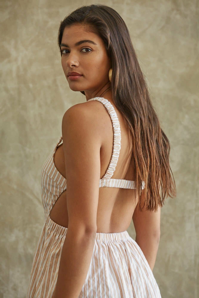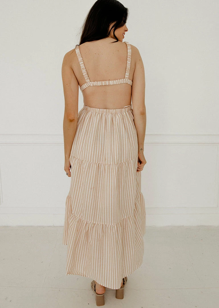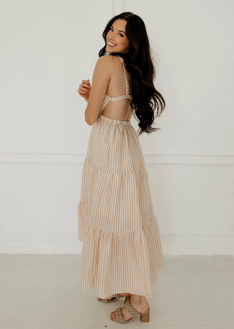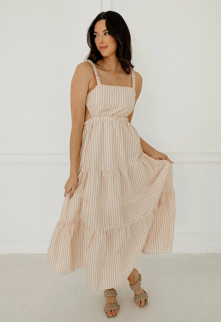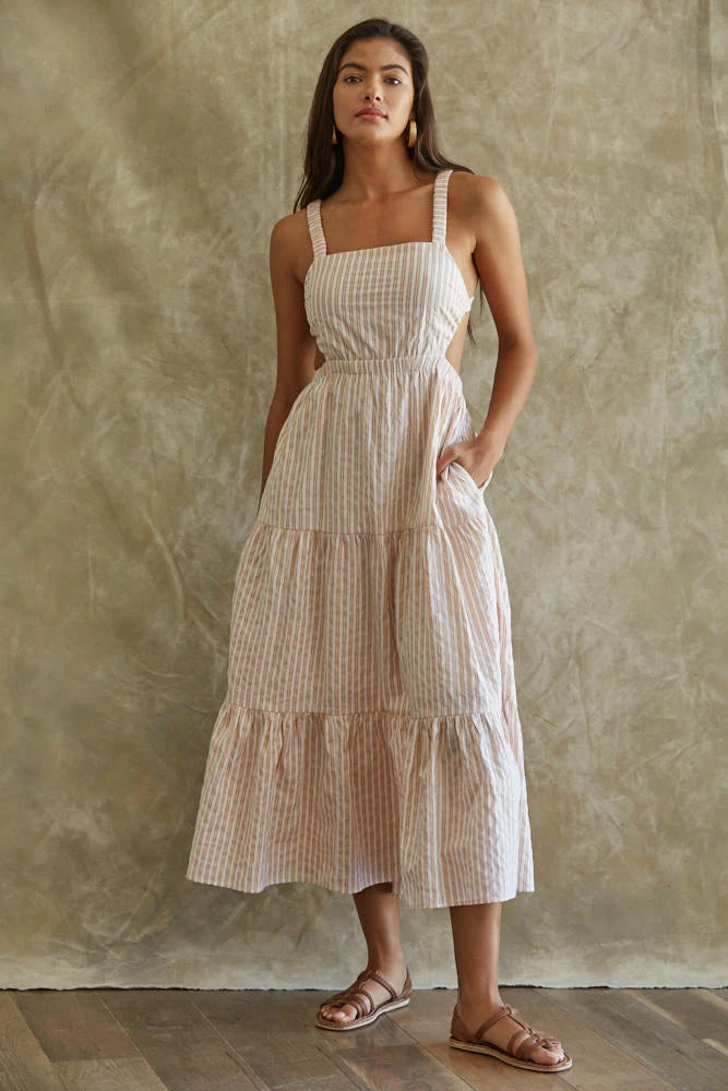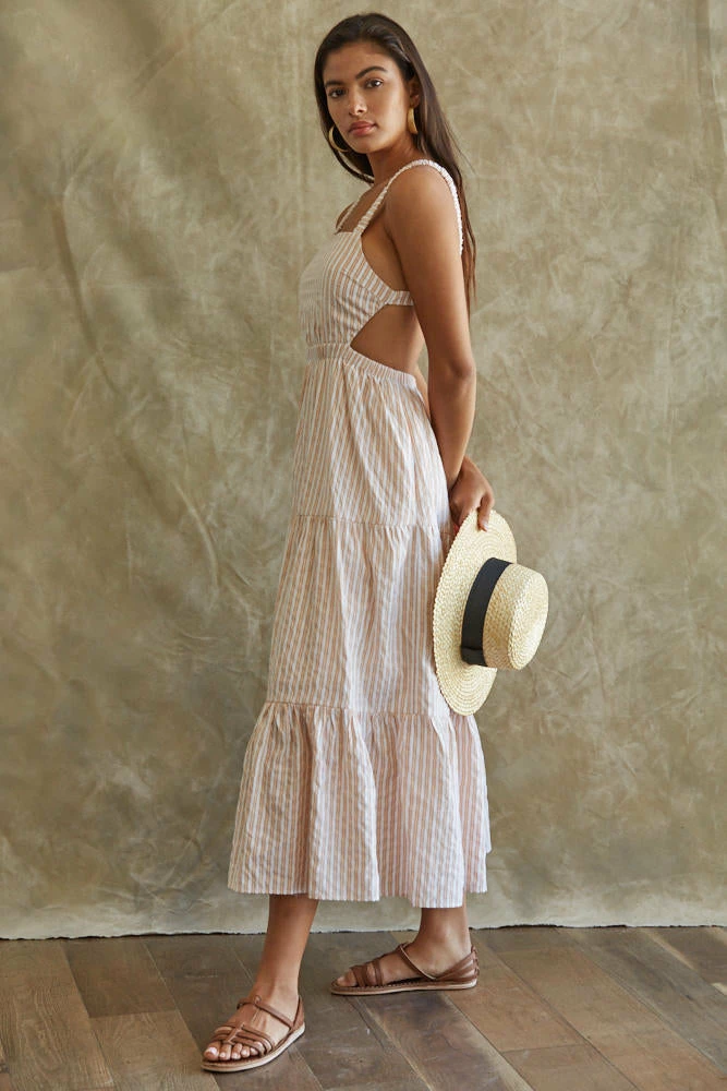 //Best Seller// Need a dress for a summer wedding? Look no further than our Afternoon Tea Striped Open Back Midi Dress! A gorgeous ivory hue makes up this cotton midi dress with stripes throughout. We love the detailed side cutouts, side pockets and open back.