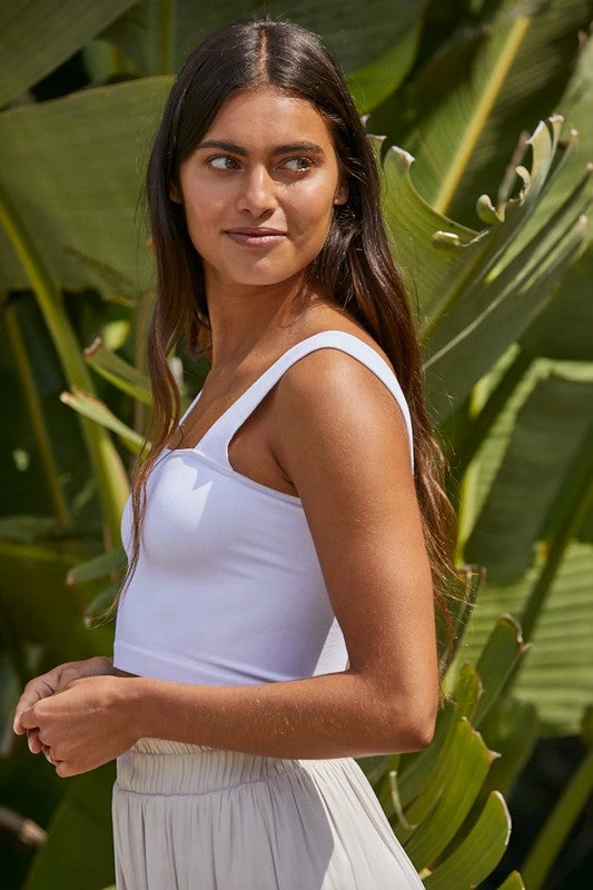 Our #1 layering tank! Our Always Lucky Seamless Crop Tank comes in a white hue. Designed with fixed tank straps. Detailed with a square neckline.
