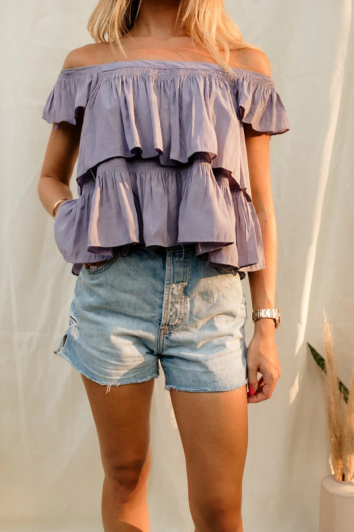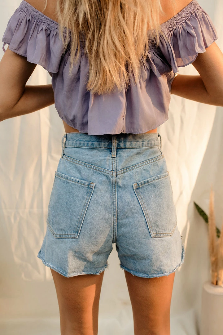 We love the look of a longer denim short! Our Aubrey High Rise Distressed Mom Shorts are a medium wash in a no stretch fabric. A raw cut hemline makes these shorts ideal for everyday casual wear. Styled with the Tori Reversible Twist Crop Top.