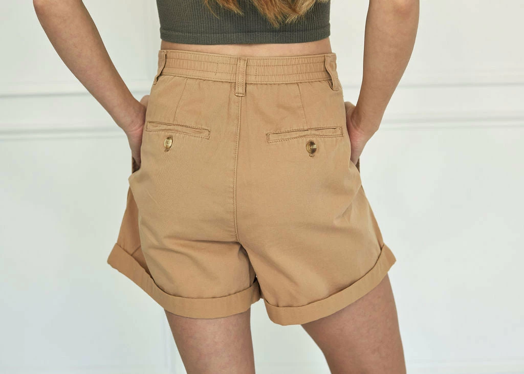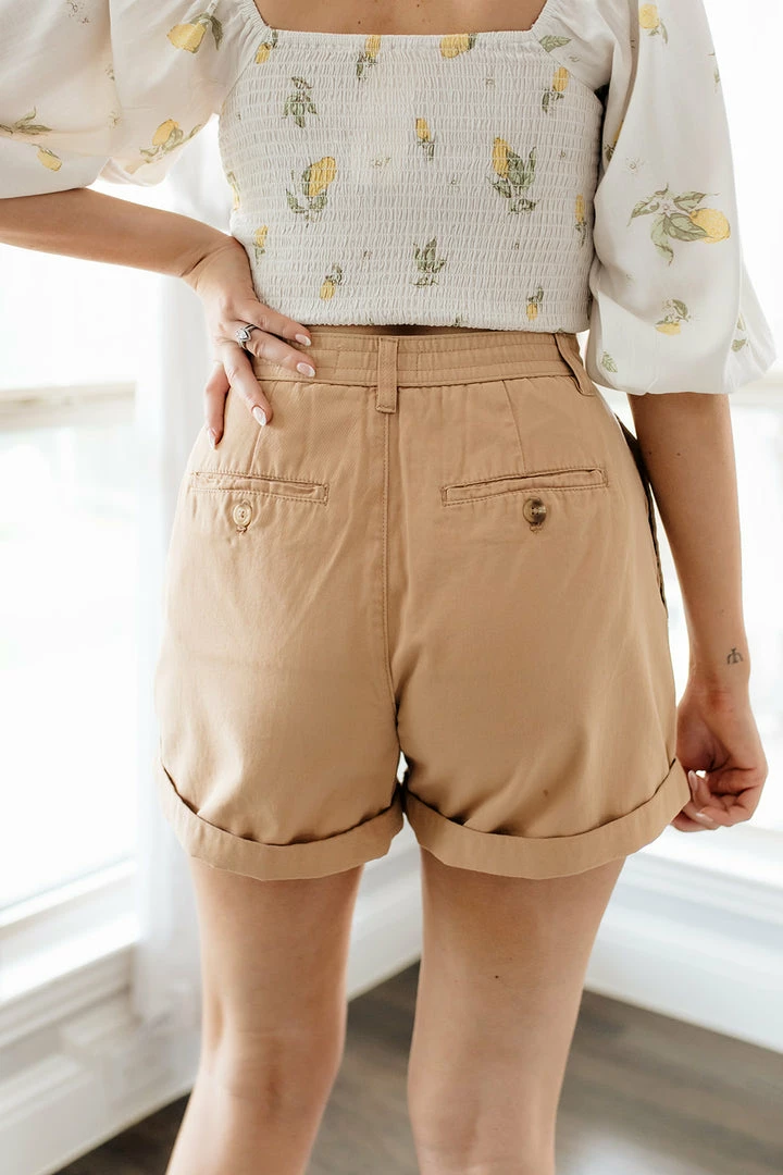 Be comfy all day in our Barnett Cotton Pocketed High Rise Shorts! These khaki colored shorts are crafted with side pockets and sewn cuffed hem. Finished with a front zipper and hook closure.