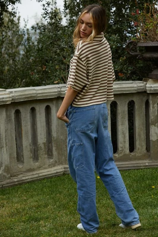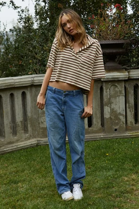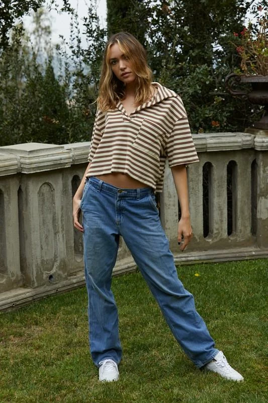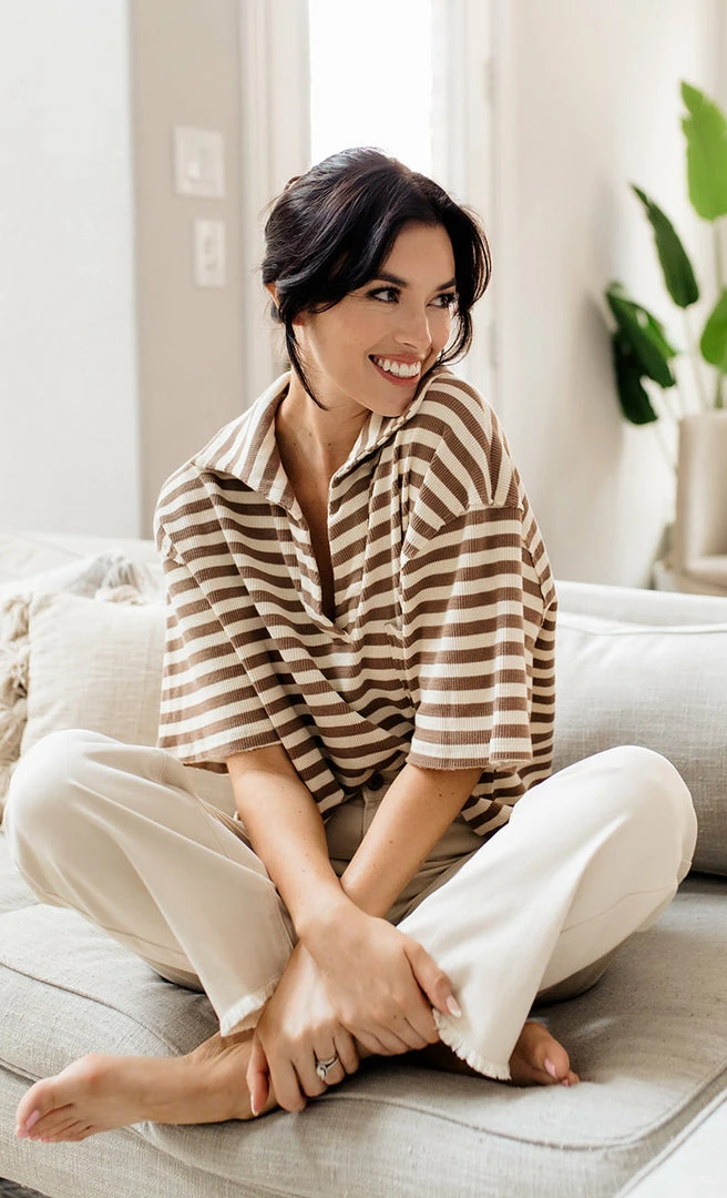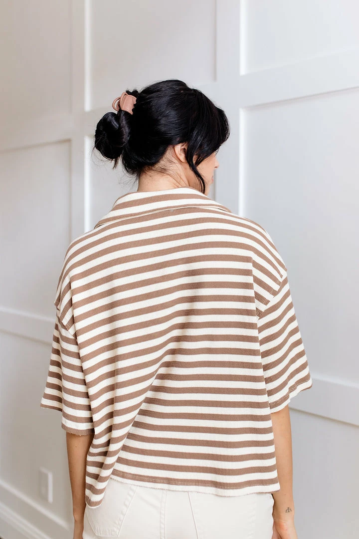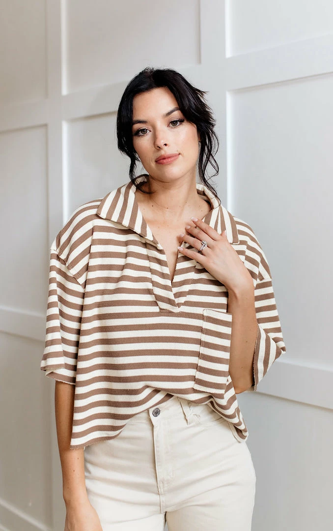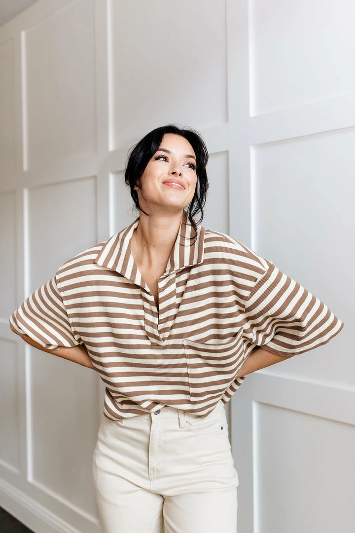 Look sporty girl chic in our League Striped Collared Knit Top! This ivory & mocha striped knit top has a collar with half wide sleeves. Add some denim and sneakers.