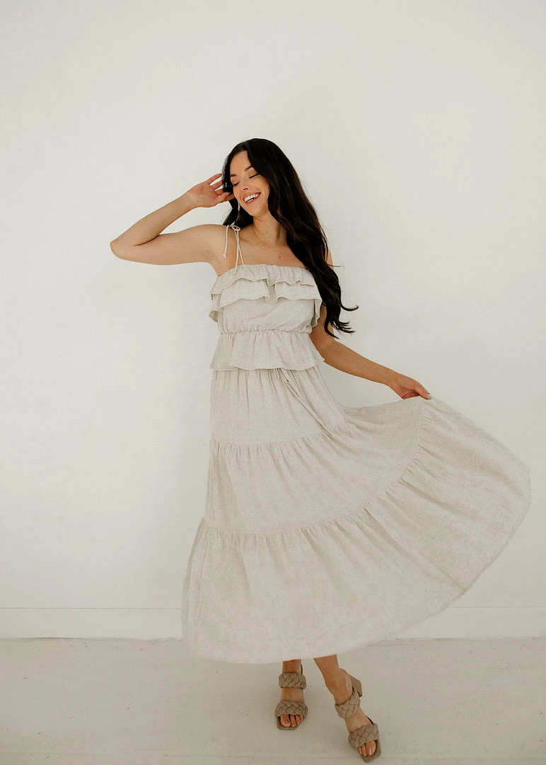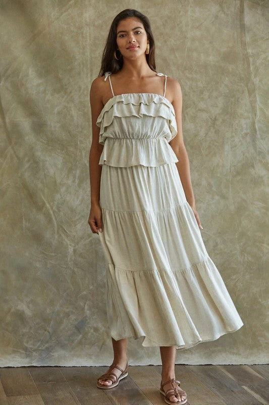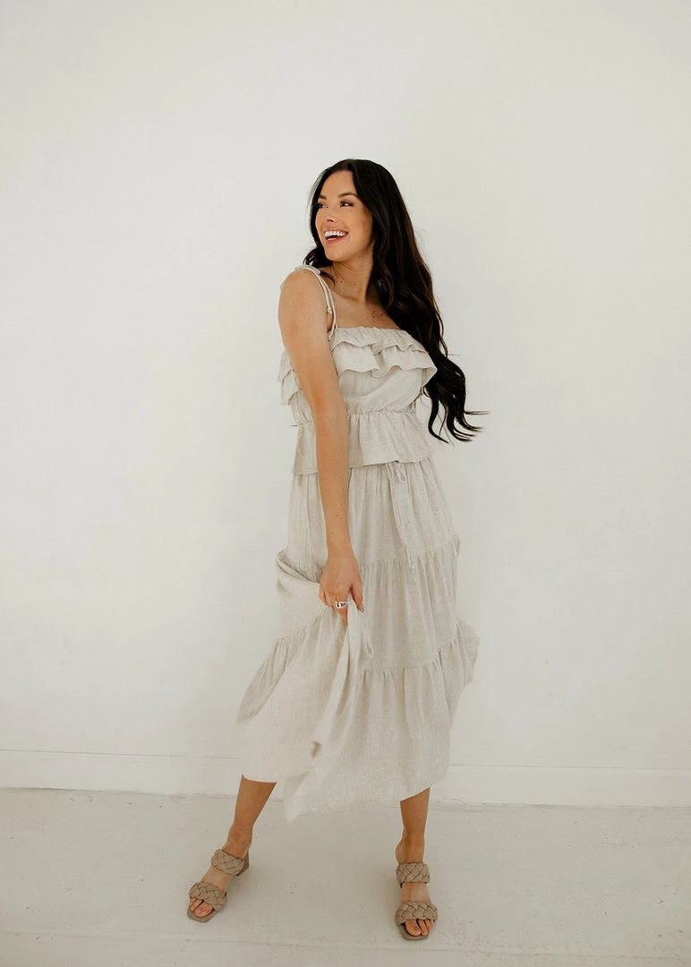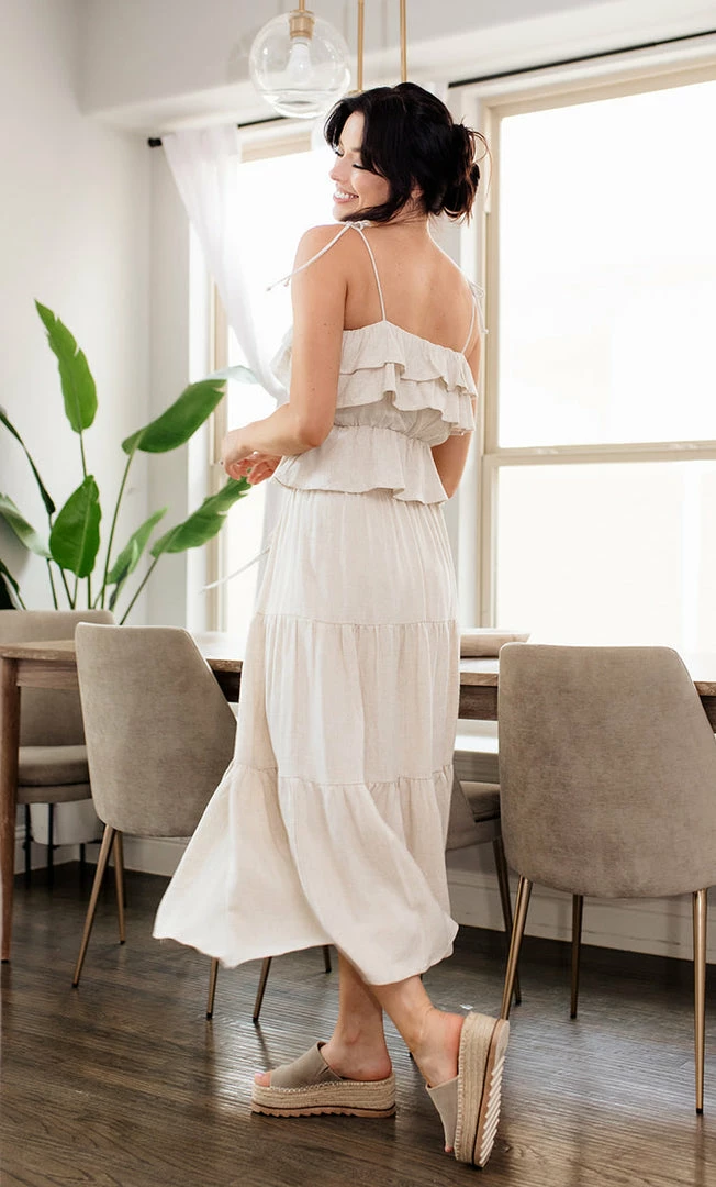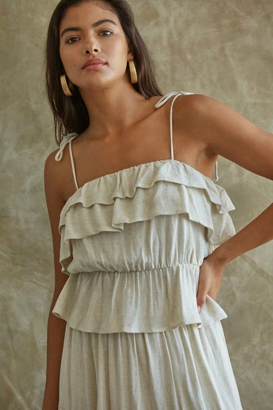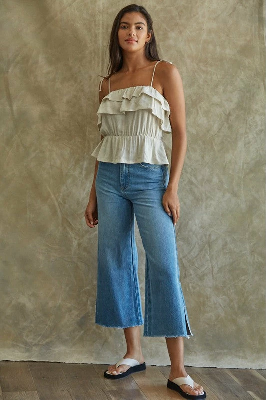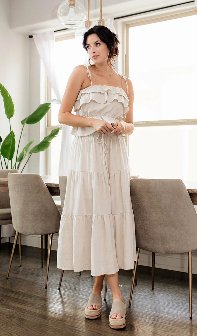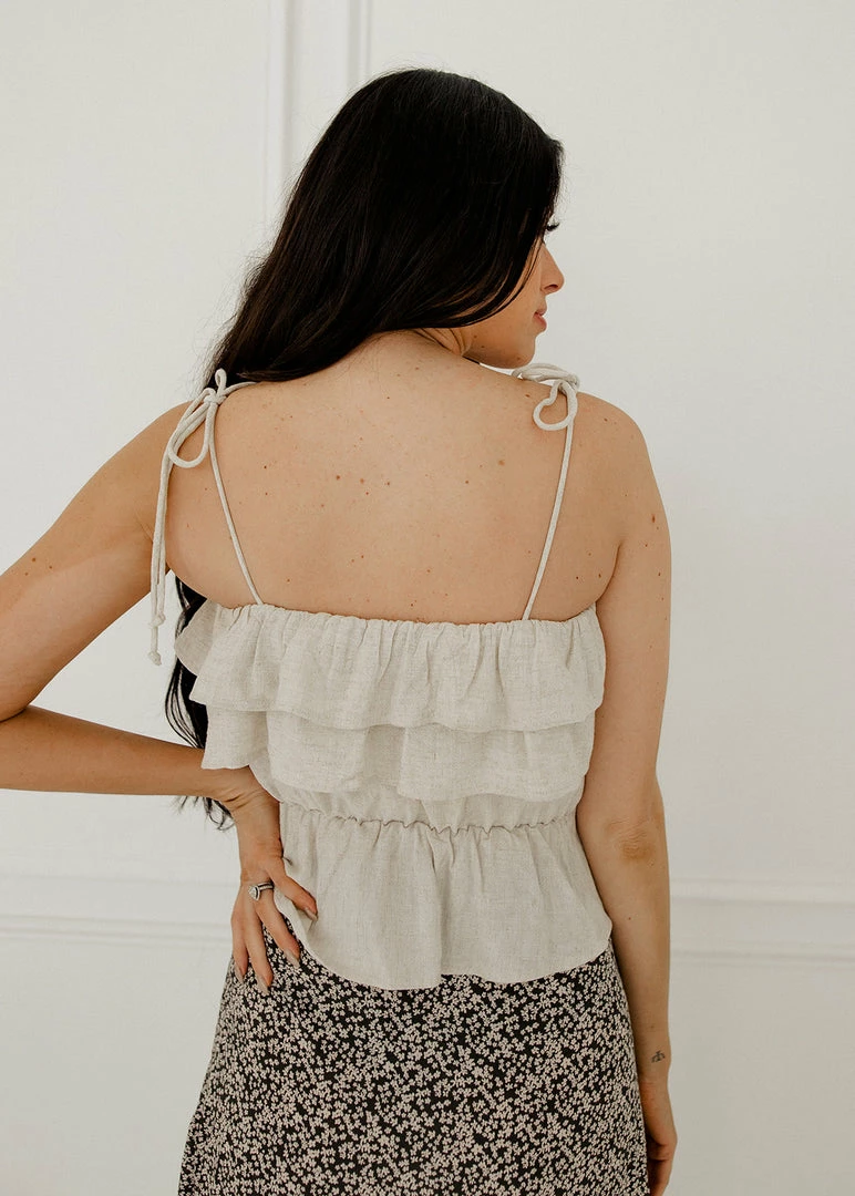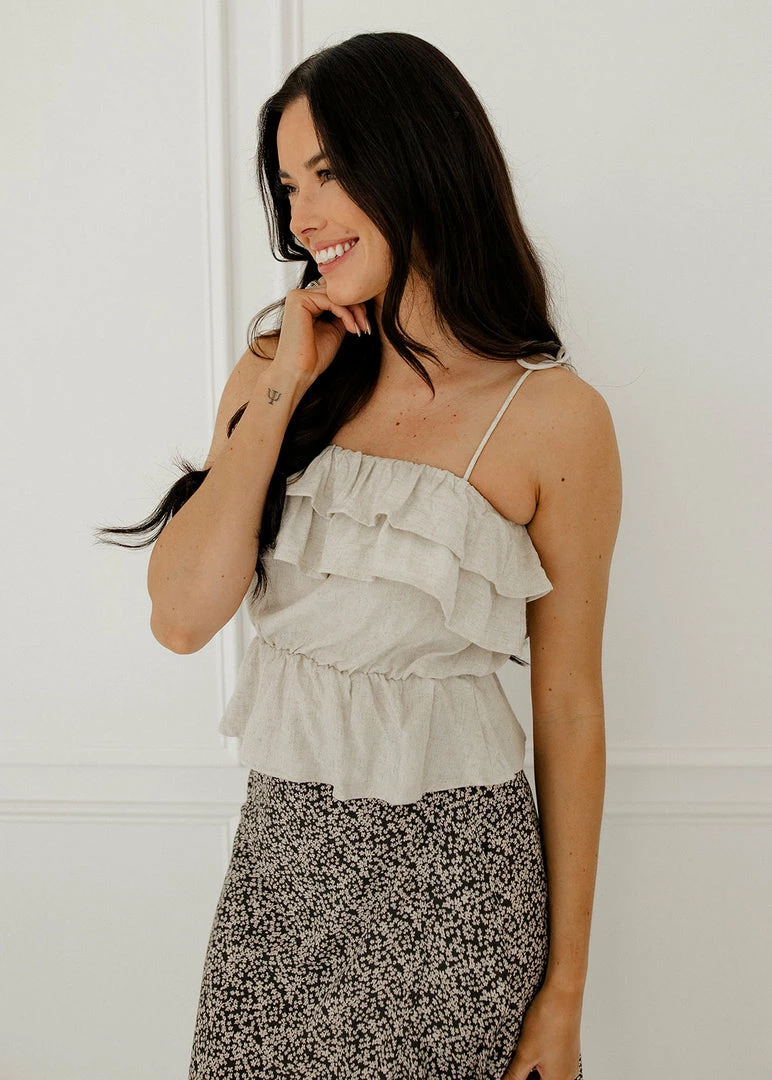 This pretty ruffle cami takes you right from spring to summer! Our Maven Linen Ruffle Cami Tank Top features ruffles on a linen oatmeal base. Finished with a ruffle trim and adjustable tie spaghetti straps.