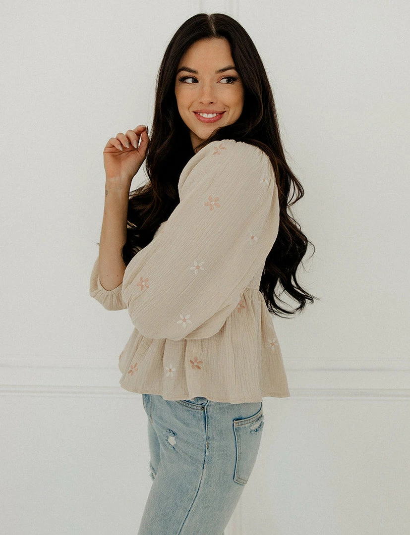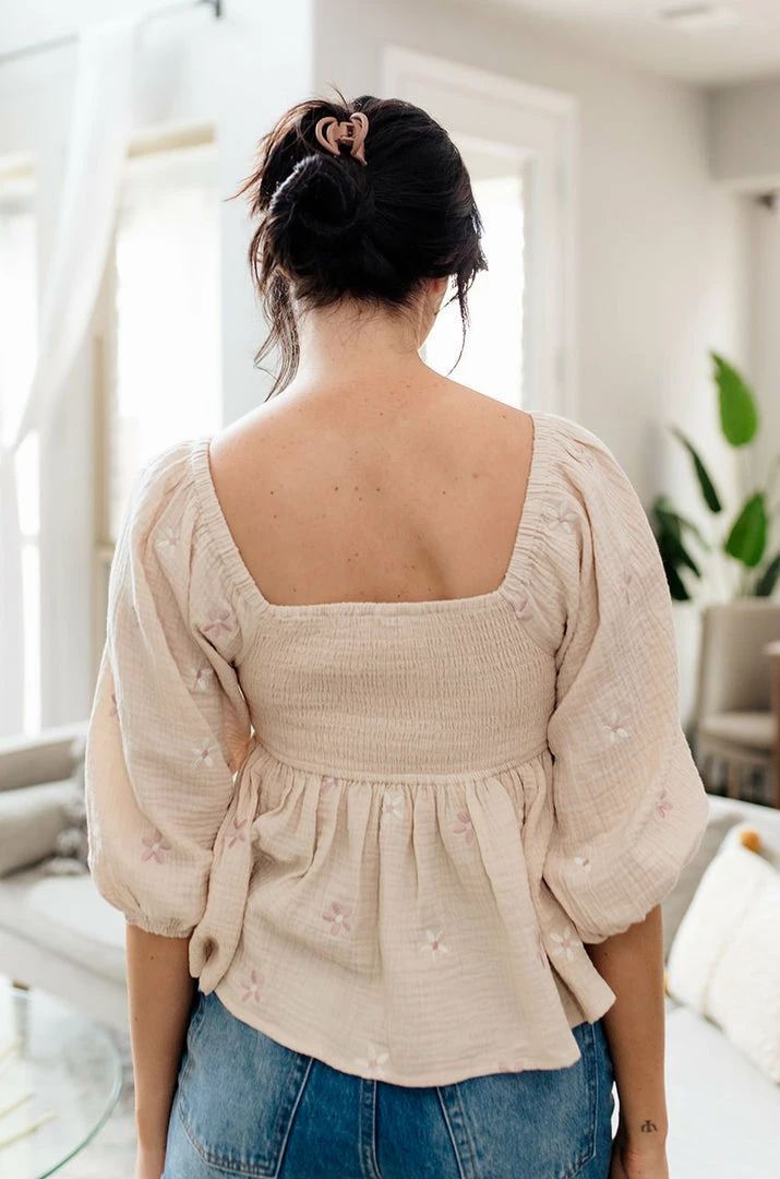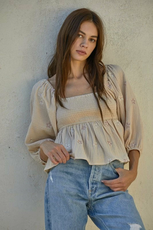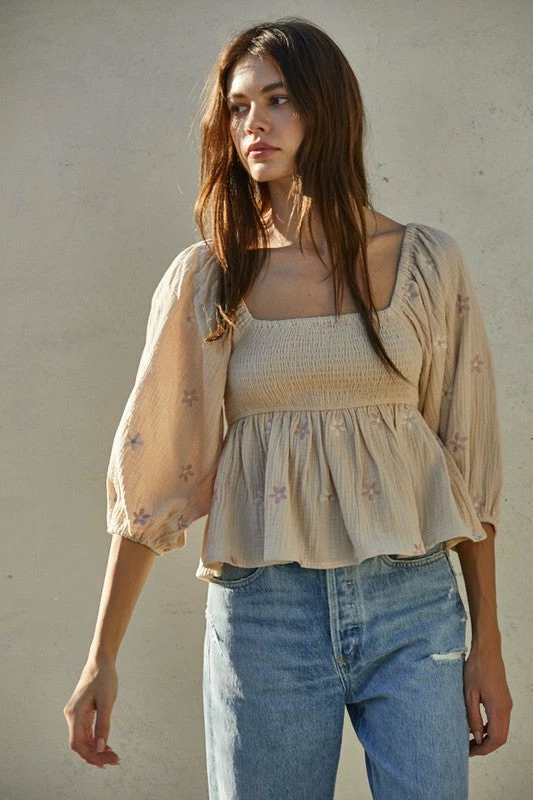 For your next brunch fit, our Nolana Floral Embroidery Balloon Sleeve Smocked Top is perfect for any occasion. This natural with pink embroidery floral blouse has florals throughout with a smocked bodice and square neckline.