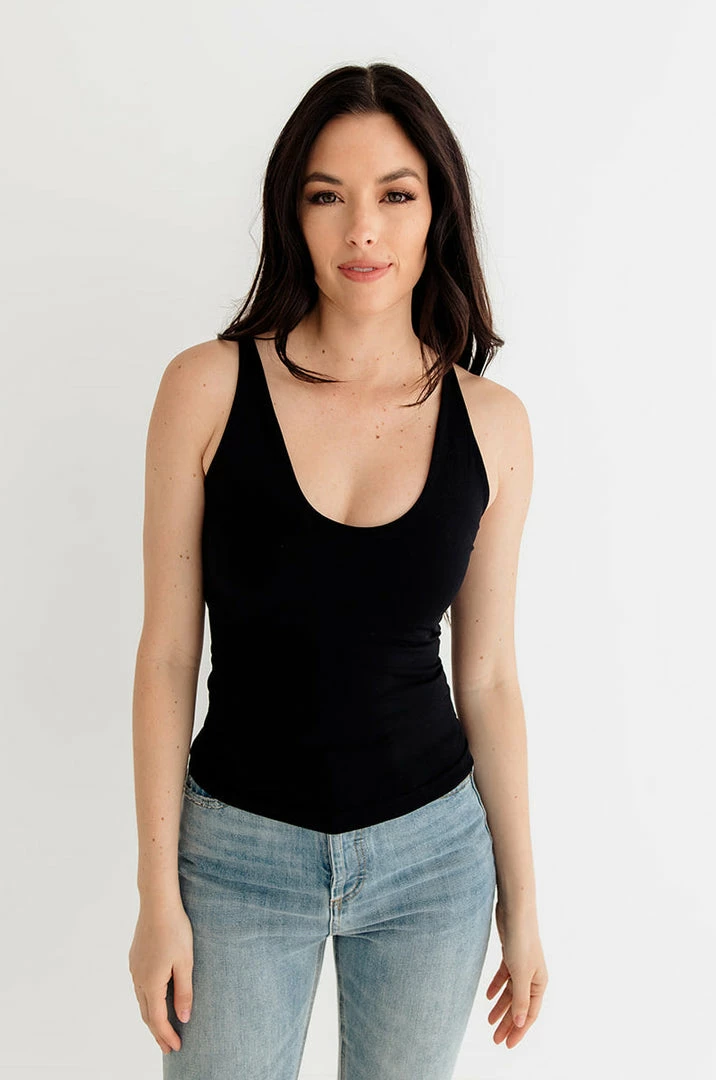 Keep calm and cool in the Seamless Scoop Neck Cami! This buttery black colored knit cami comes in a fitted silhouette with a scoop neckline and fixed straps. The soft stretchy fabric is extremely flattering while the built in bra provides extra coverage. Pair this versatile top under cardigans and jackets for a classic look.
