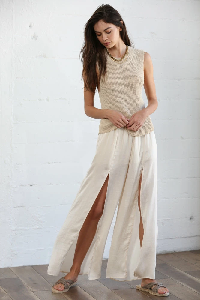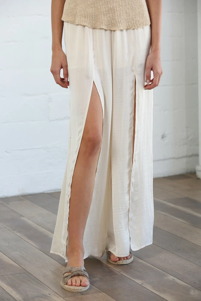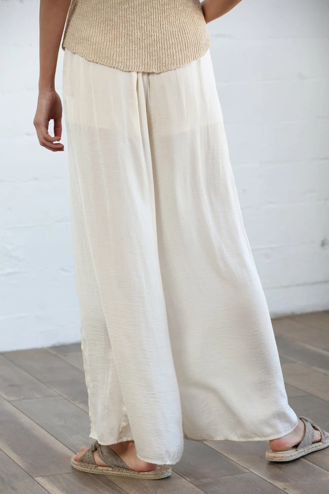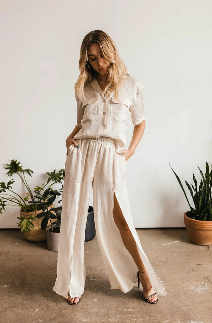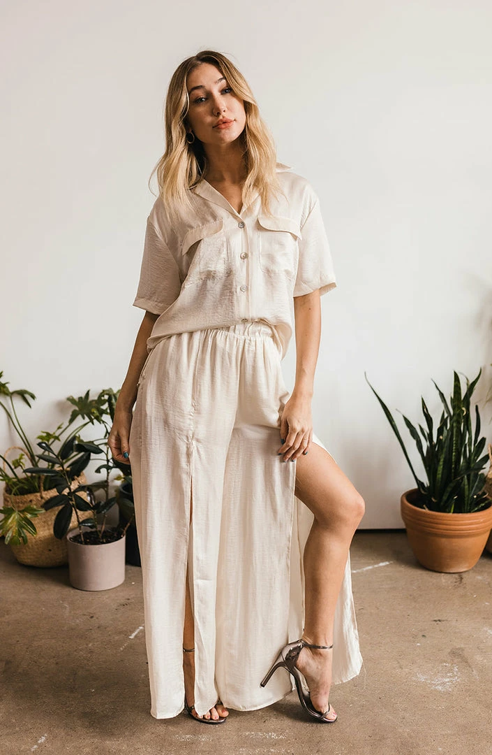 Lounging in satin sounds like a dream! Our Blue Moon Slit Satin Pants upgrade your at-home look in their cream hue with an elastic smocked waist. This style has lined shorts for coverage! These high rise wide leg pants are a must have! Styled with the Blue Moon Utility Satin Blouse.