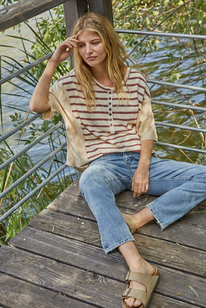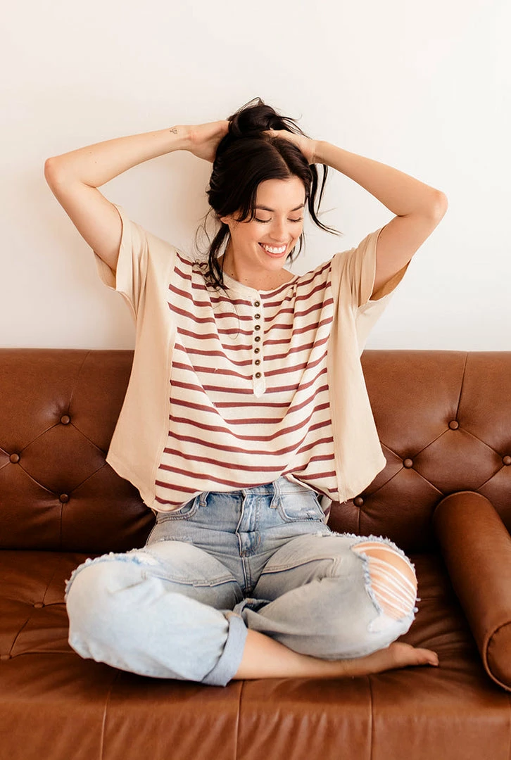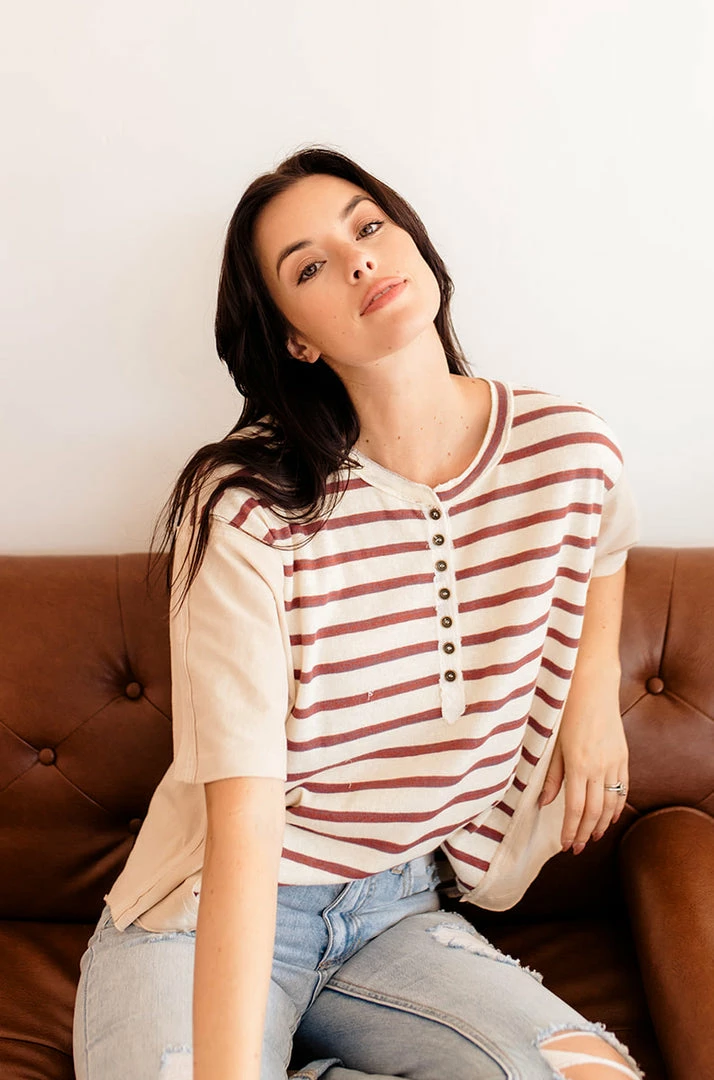 The wear everywhere button down top! Our Bobbi Henley Striped Button Down Tee comes in an burgundy & cream stripes with a contrast taupe sleeve. Finished with front henley style button closures.
