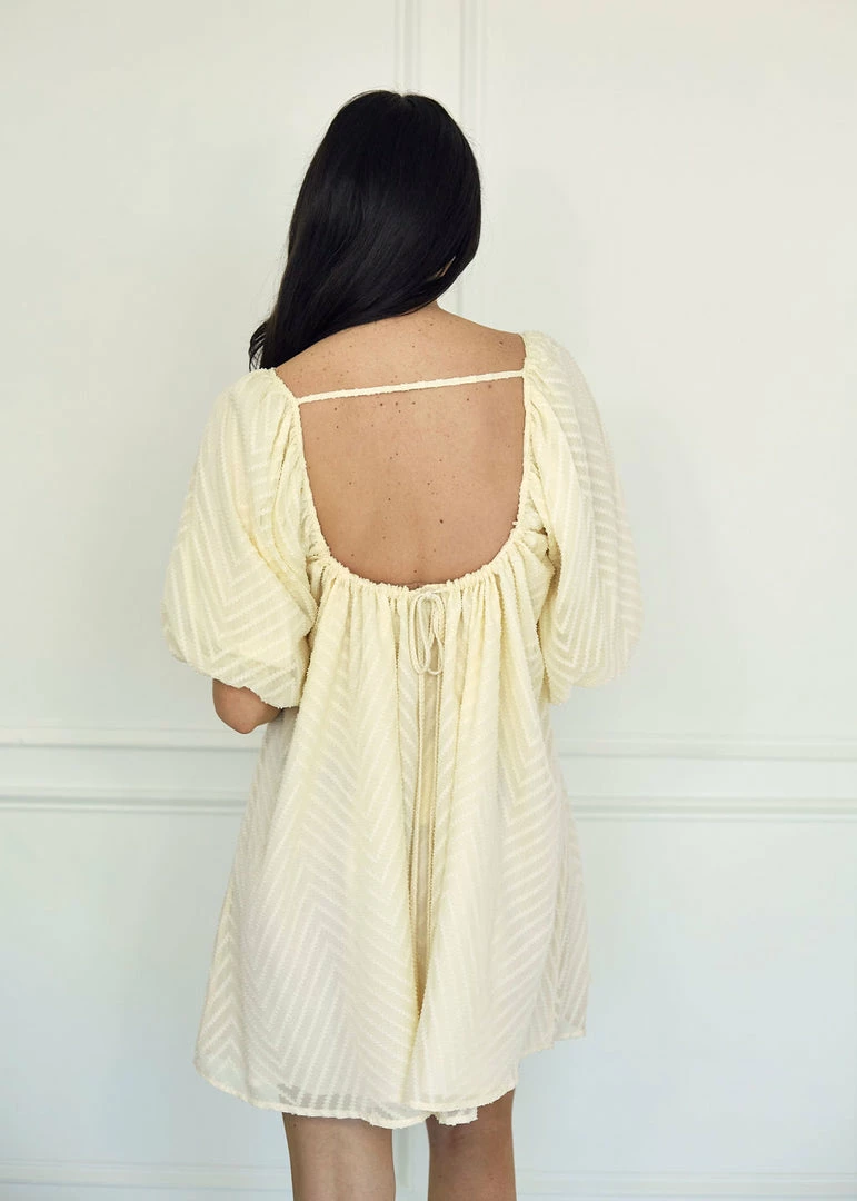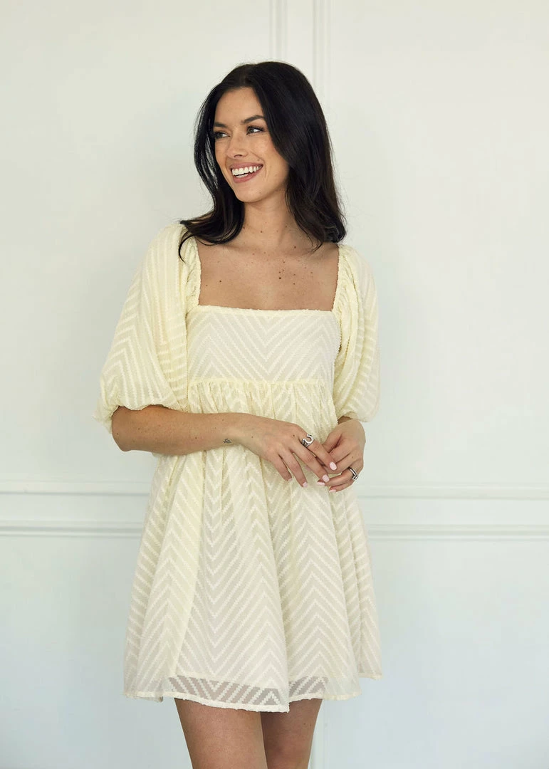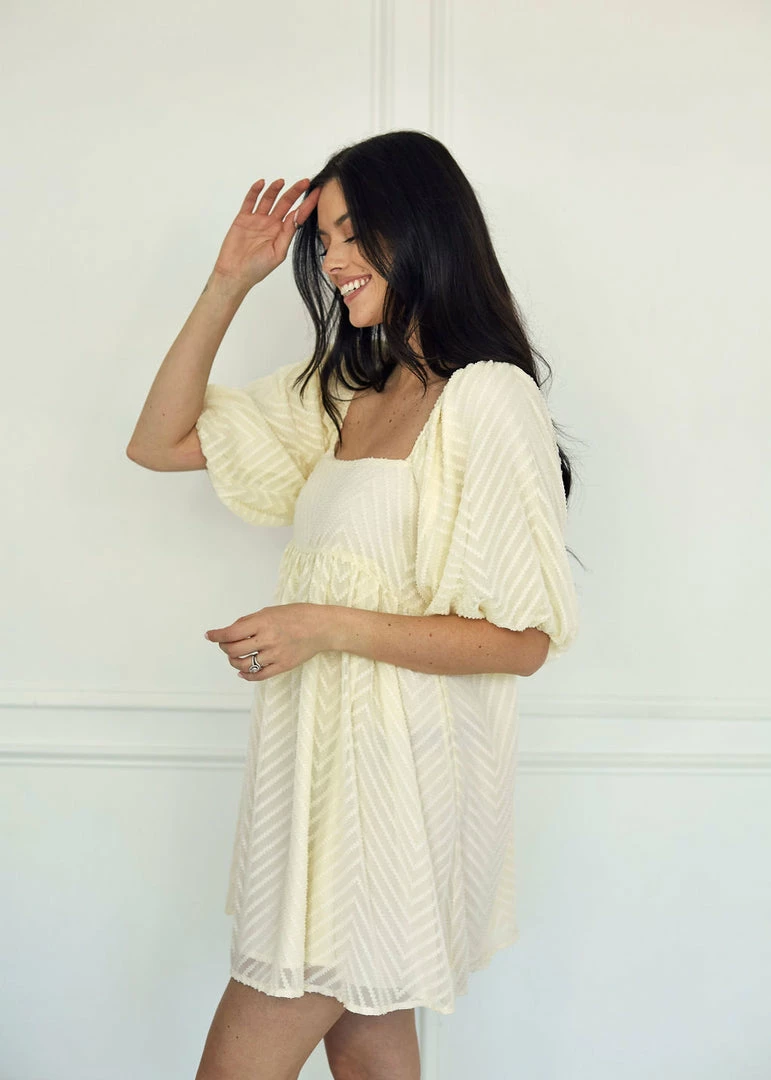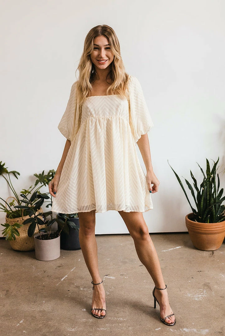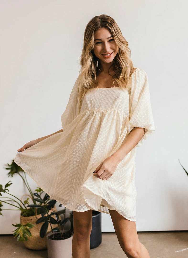 Our Bridgerton Jacquard Babydoll Dress comes in the cutest print! This ivory jacquared babydoll dress has a square neckline with a self tie open back detail. Adored for it’s ¾ sleeves with elastic puff sleeve hems!