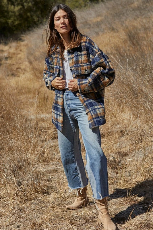 Our Bridgeview Pocketed Plaid Jacket will be your cold weather hero! This navy and taupe shacket is secured with front button closures. Designed with a rounded hemline and side pockets. Finished with 2 bust pockets.
