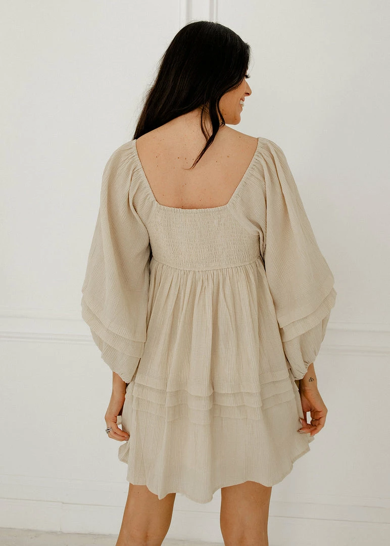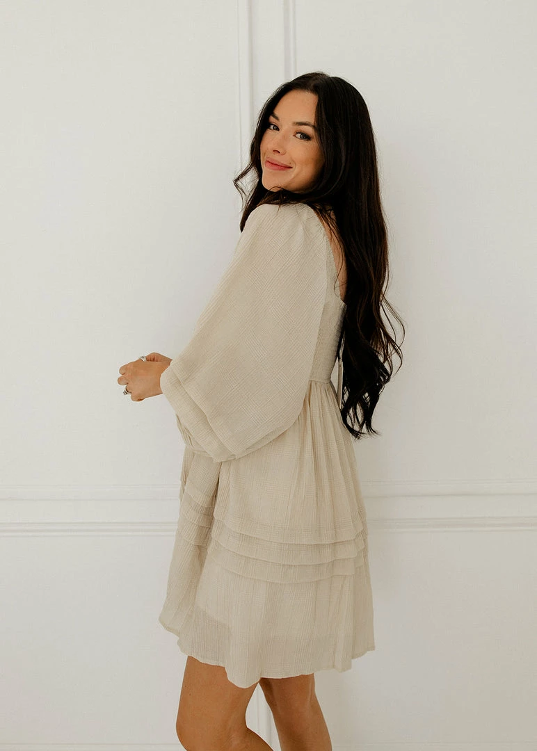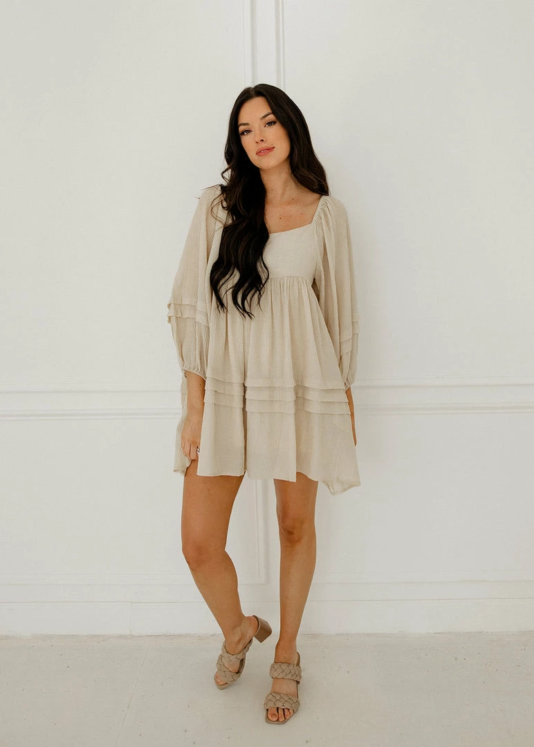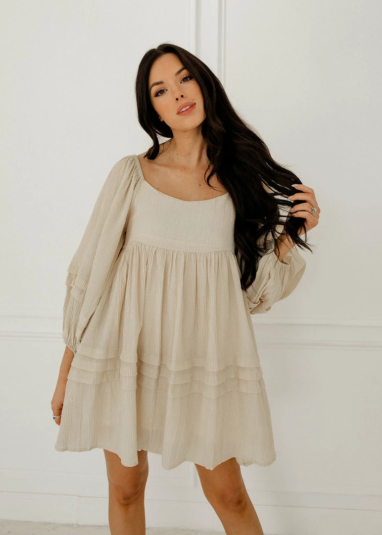Our Genevieve Pocketed Babydoll Dress is the most beautiful in this mocha hue! This textured babydoll dress has a relaxed fit and a square neckline with long sleeves and side pockets.