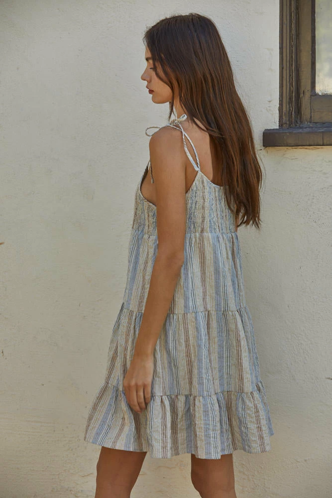 Bright bands of oatmeal, blue and brown give the Remi Striped Smocked Tiered Dress vibrance and charm. Designed with side pockets & self tie straps.