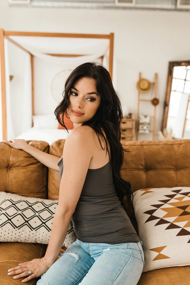 We love a simple + clean finish! Our Seamless Cami Tank is an essential piece for every wardrobe. Made with a soft and stretchy pewter jersey, fixed straps and a seamless hemline. No fuss, no worry, just a perfect fit!