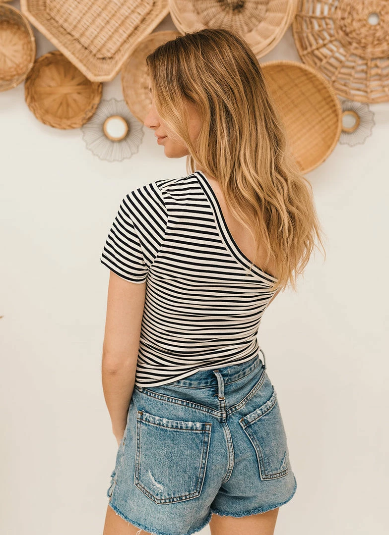 //Best Seller// We’re obsessed! Our Charlie Striped Ribbed One Shoulder Top is flattering and chic. The soft ribbed knit fits snuggly and stretchy throughout. One short sleeve complements the trendy one shoulder neckline to finish the look. A chic black & white knit top to style for date night with distressed denim and sassy heels!