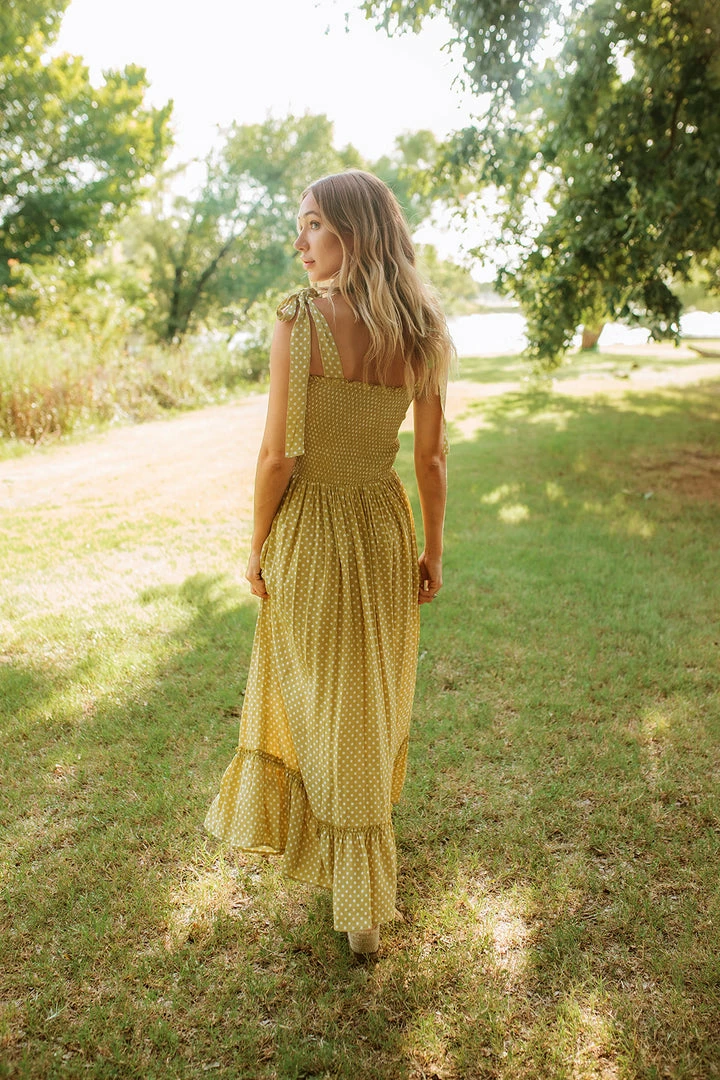 Take a trip to Chloe Polkadot Smocked Tie Maxi Dress! This lemon color polkadot fabric maxi has a fitted smocked bust complete with a flowy skirt. Just add tan kitten heels!