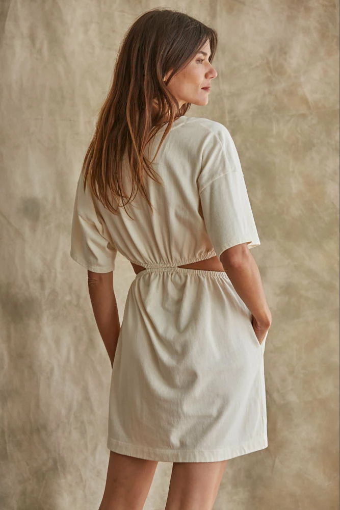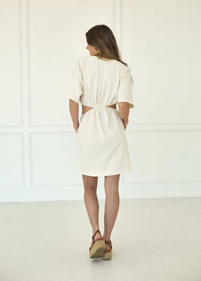 Our Clarissa Cutout Cotton Pocketed Dress is sweet for brunch with your girls! This cream mini dress is detailed with side waist cutouts. Designed with short sleeves.