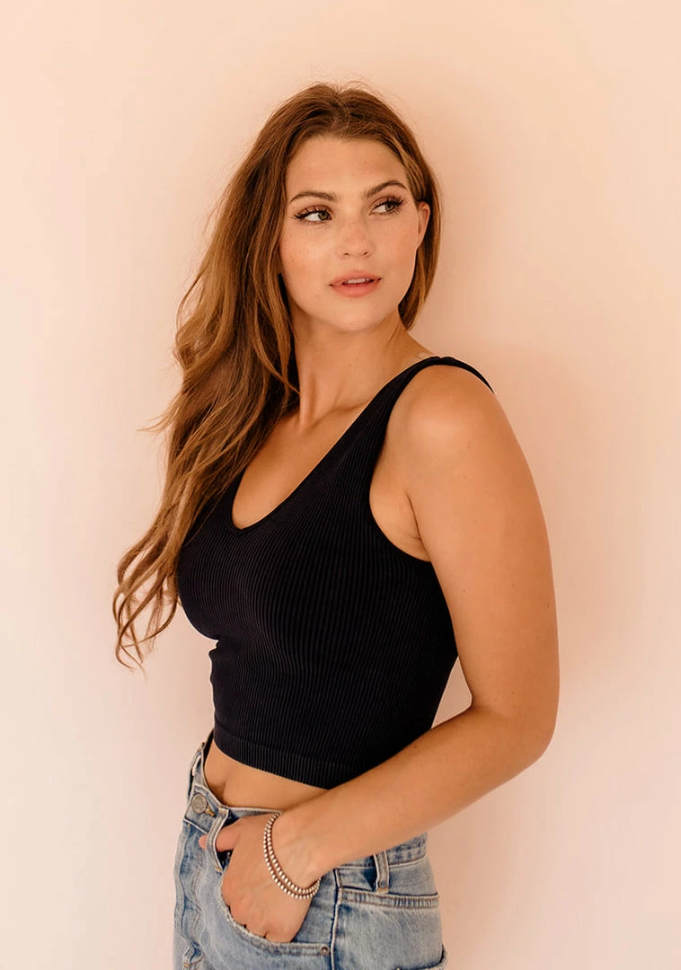 Your wardrobe needs a classic, fitted tank! Our Connor Seamless Ribbed Brami  comes in a ribbed design. Designed with a sultry u/v-neckline and a seamless style. A true transitional staple!