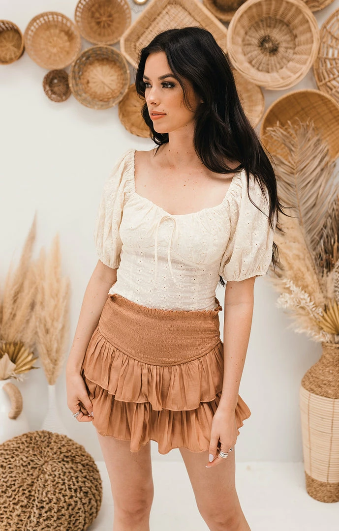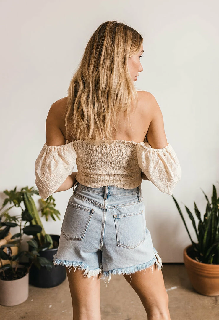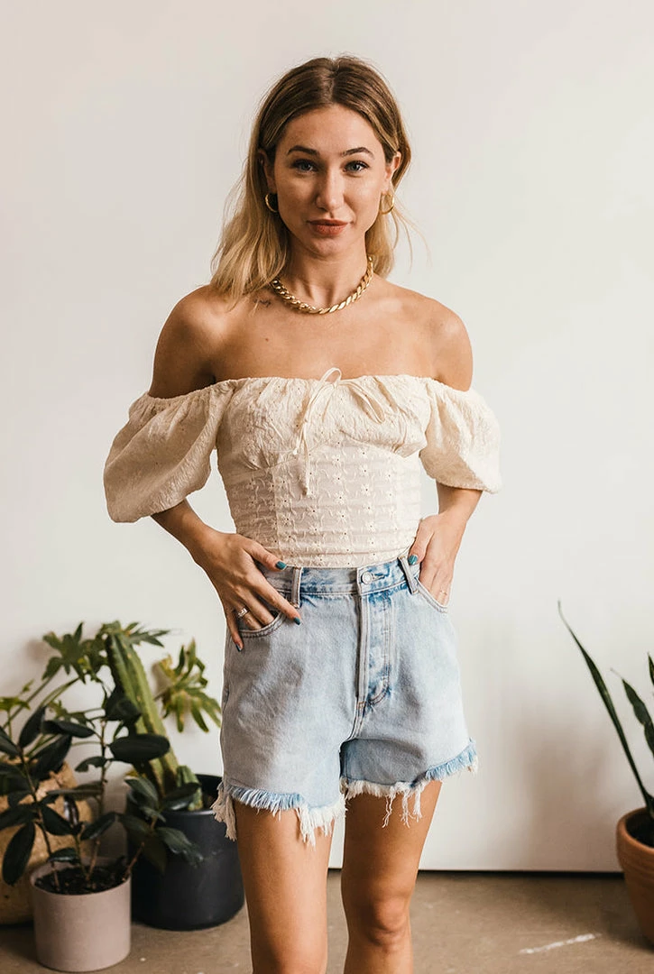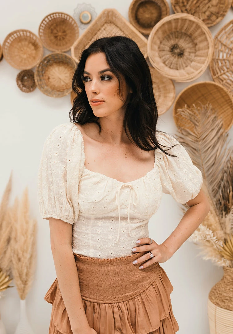 Be ready for Sunday brunch on our Dolores Cotton Embroidered Eyelet Top! This ivory top has a square neckline and an embroidered eyelet chest with puffy sleeves and elastic cuffs.