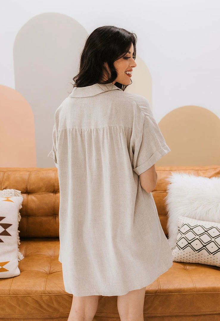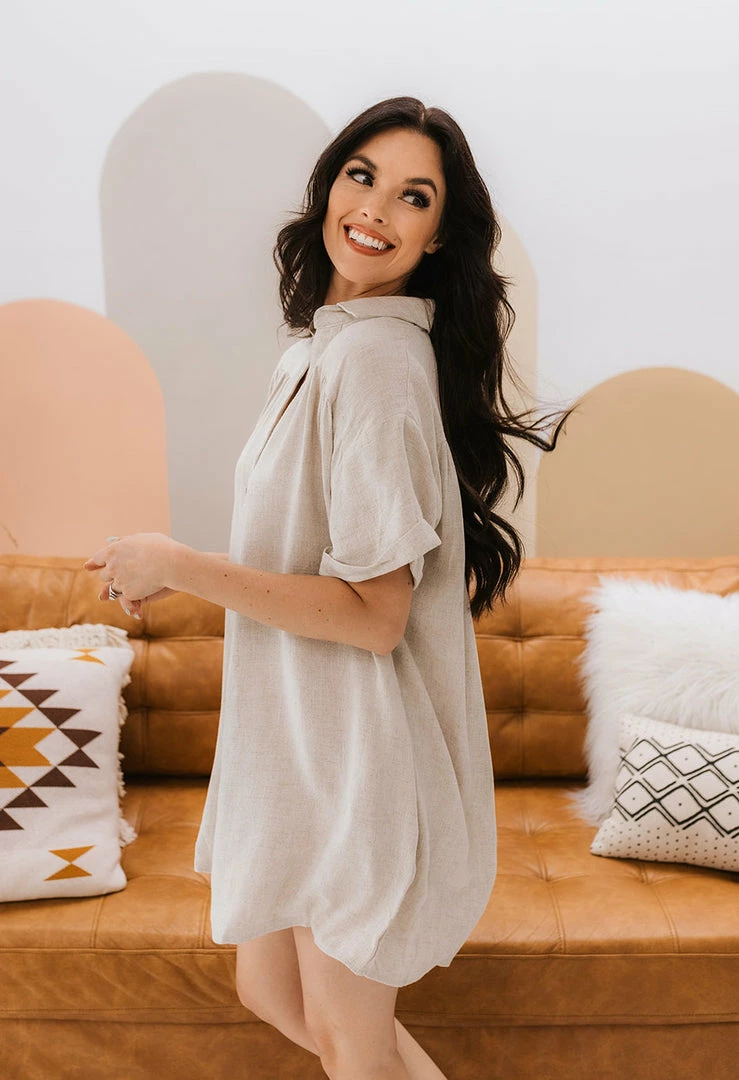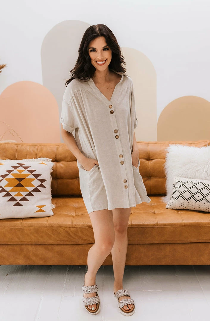 Your chic twist on a classic muumuu! Our Jane Linen Button Down Dress is made for casual days paired with minimal sandals. This beige dress has a button down detail and front pockets.