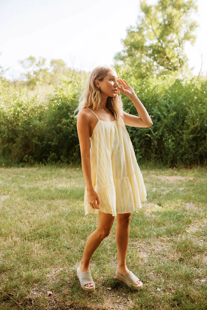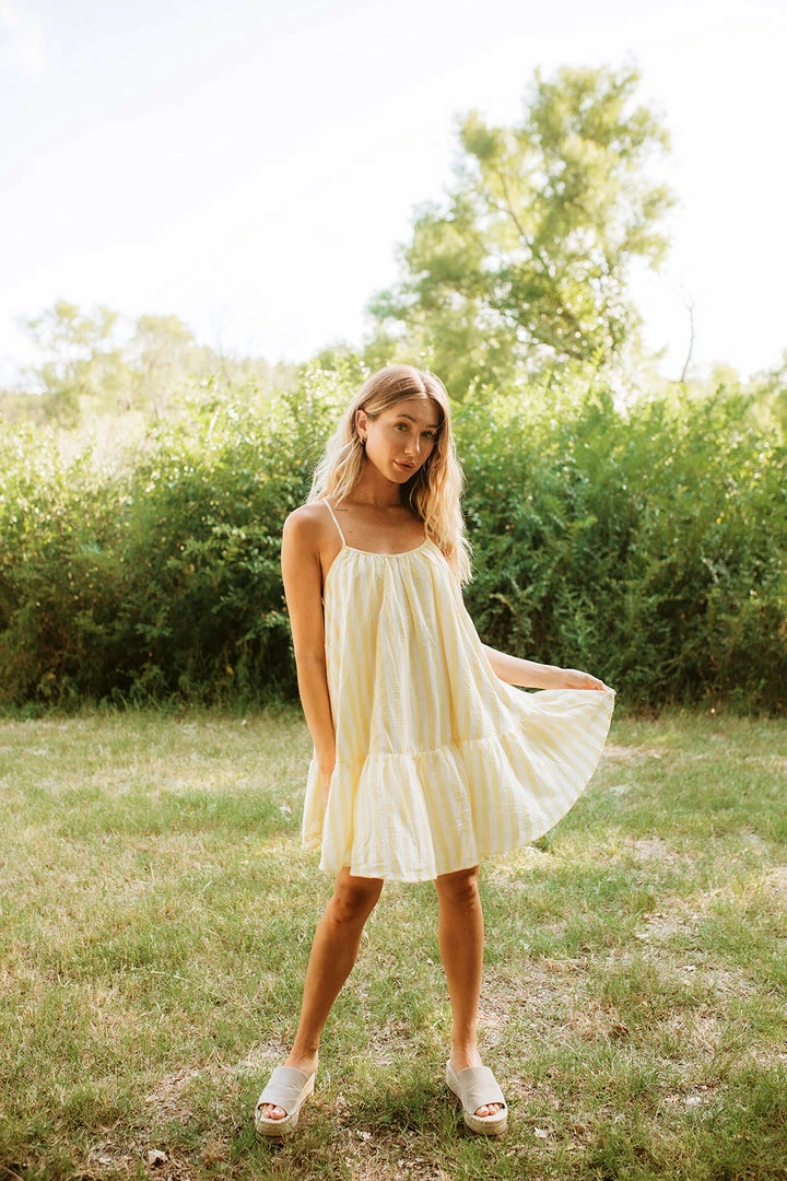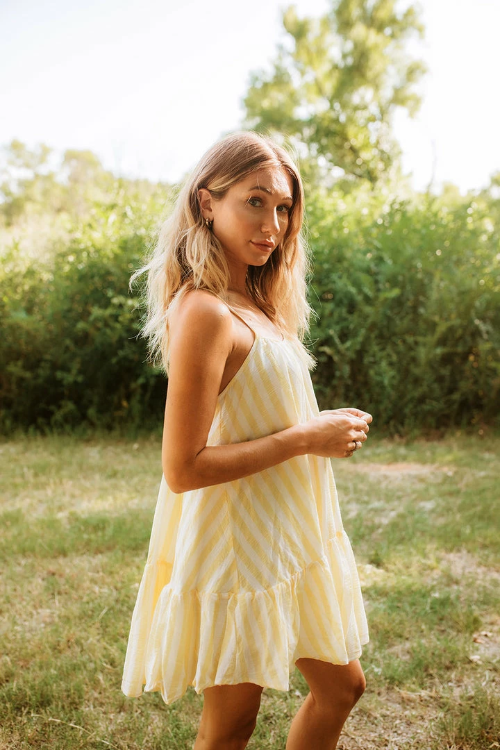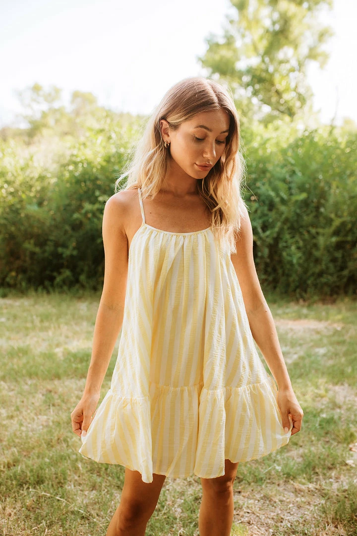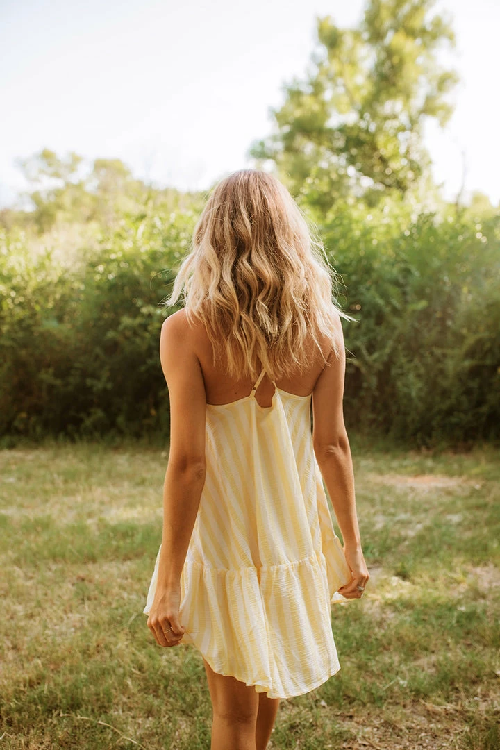 Take a trip to the Hamptons in our Kaylum Striped Peplum Dress! white and lemon stripes combine to make this striped dress. A x back has adjustable straps that secures the neckline.