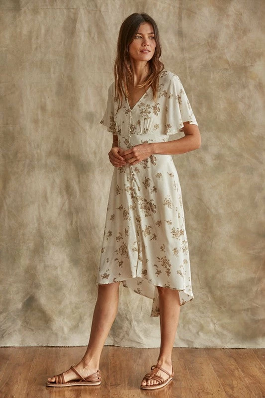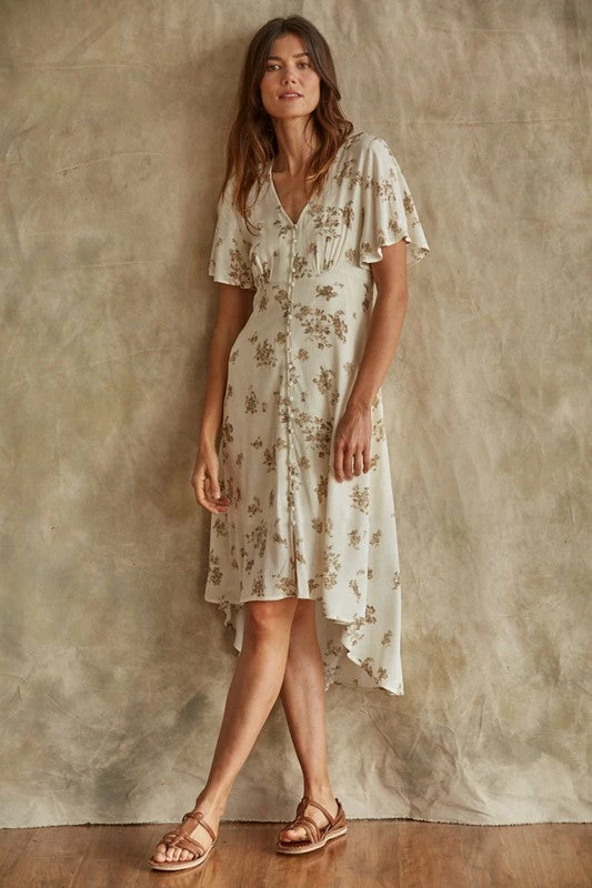 //Best Seller// High low dresses are so flattering on every shape! Our Samantha Floral Button Down High Low Dress is a ivory base with an tan floral print. This button down midi has a v neckline and a high low hemline.