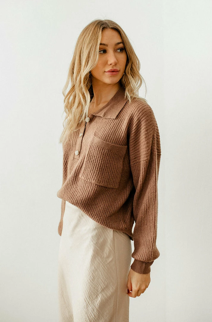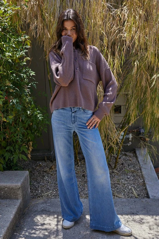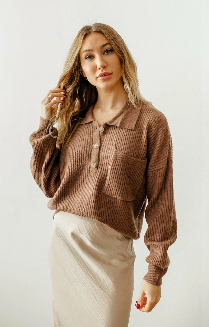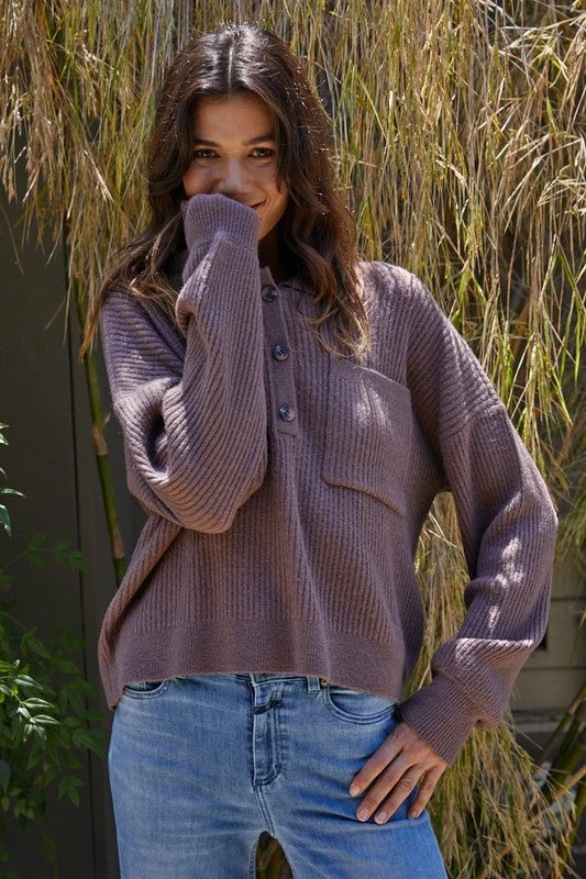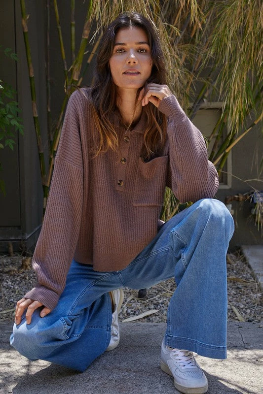 Casual days are what this henley is made for! OurDutch Knit Button Down Placket Sweater looks so fab with light or dark denim. This chocolate ribbed knit sweater has long sleeves and front henley button closures with front chest pocket.
