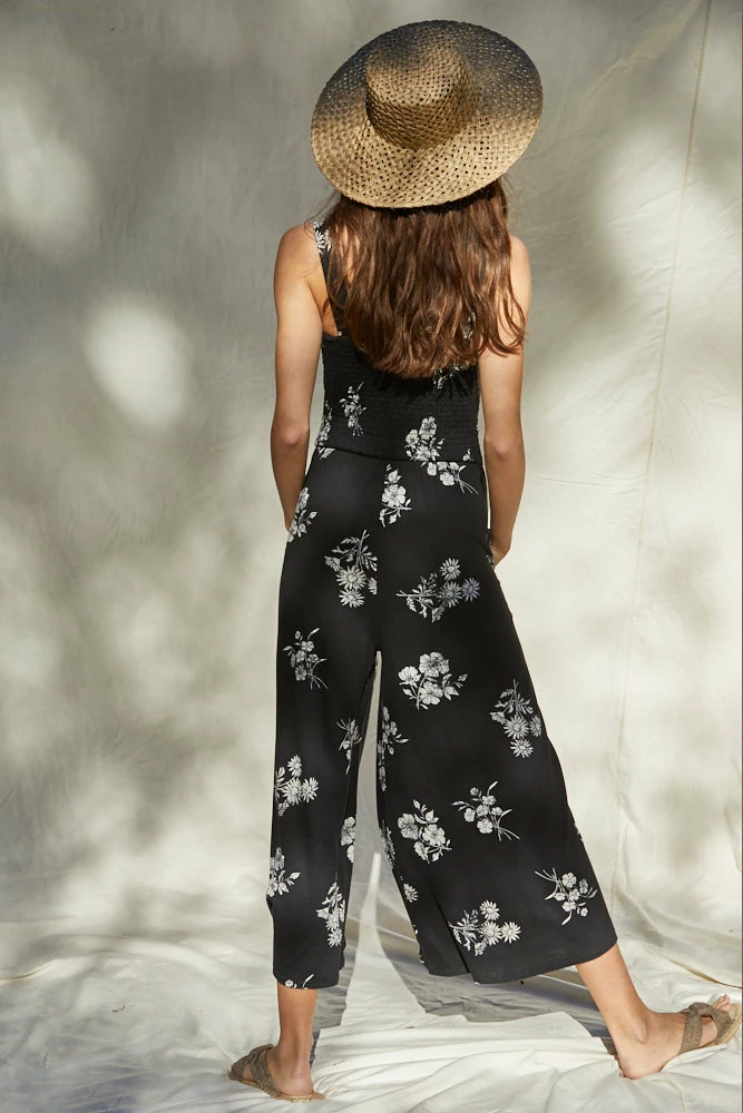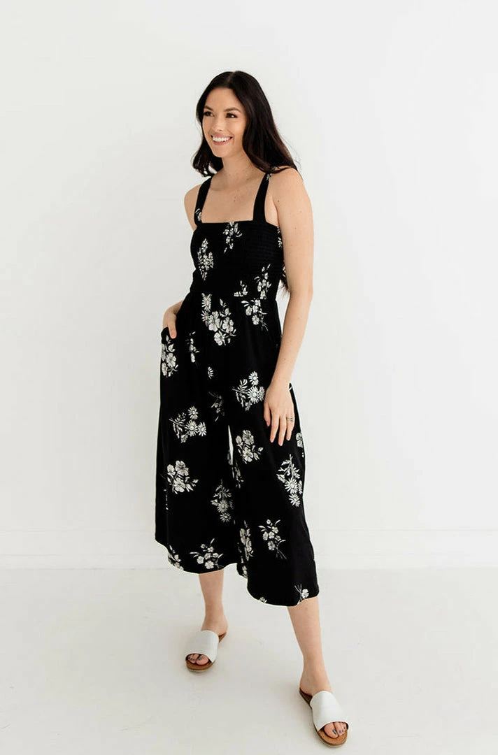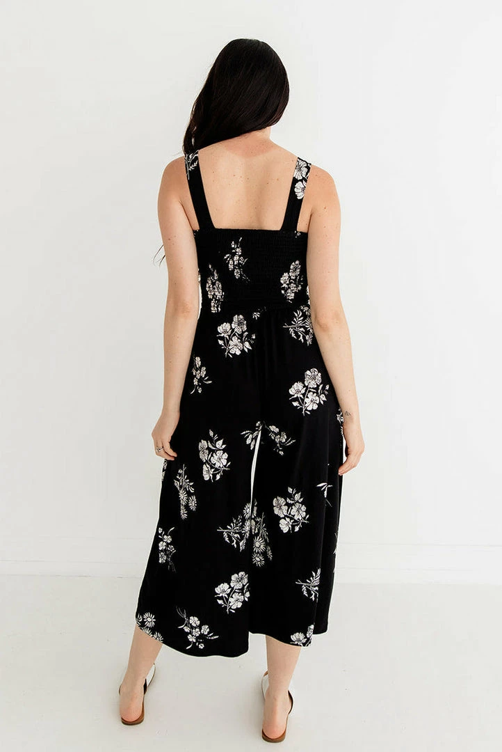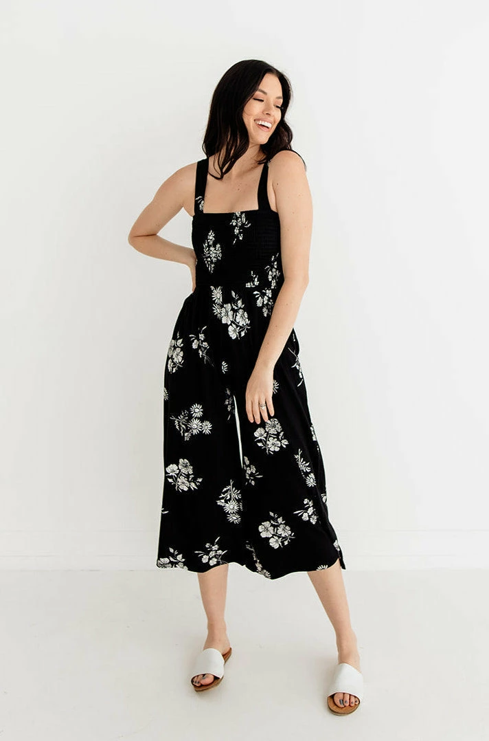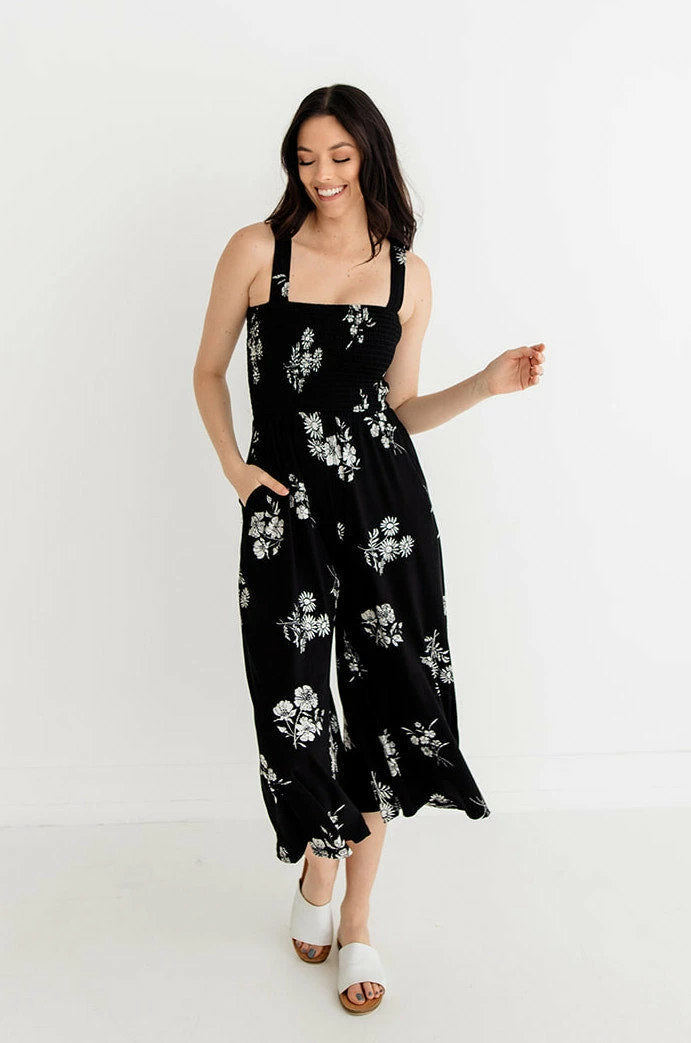 Resort Vibes are high in our Fairview Floral Smocked Jumpsuit! This black base jumpsuit displays florals in white throughout. Finished with a smocked bodice and flared pant leg.