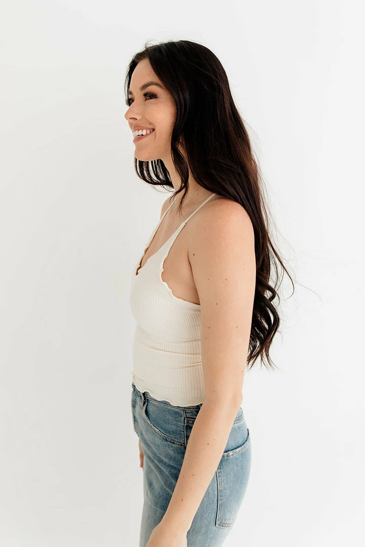Our Forever Young Seamless Frill Ruffle Tank Top is a fitted silhouette with ruffle trim along the edges with adjustable straps.