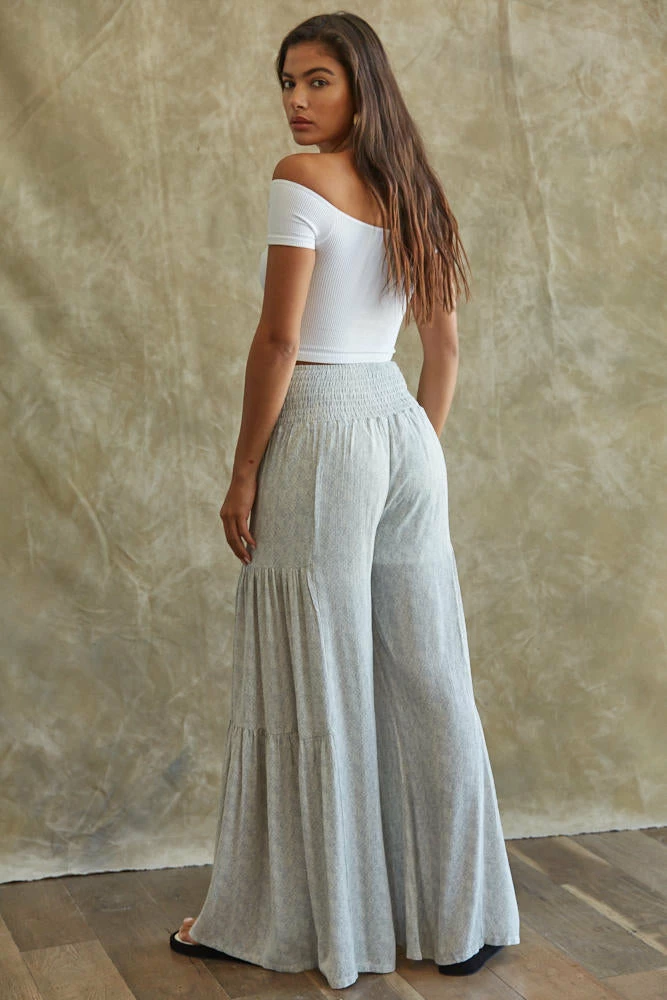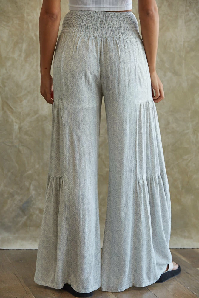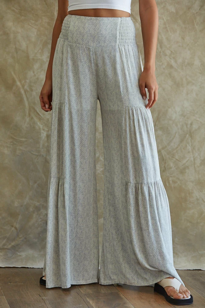 How iconic is the color and print on our Go With The Flow Wide Leg Pants? These grey and white pants have an wide leg and a flattering, smocked waist. Finished with lining.