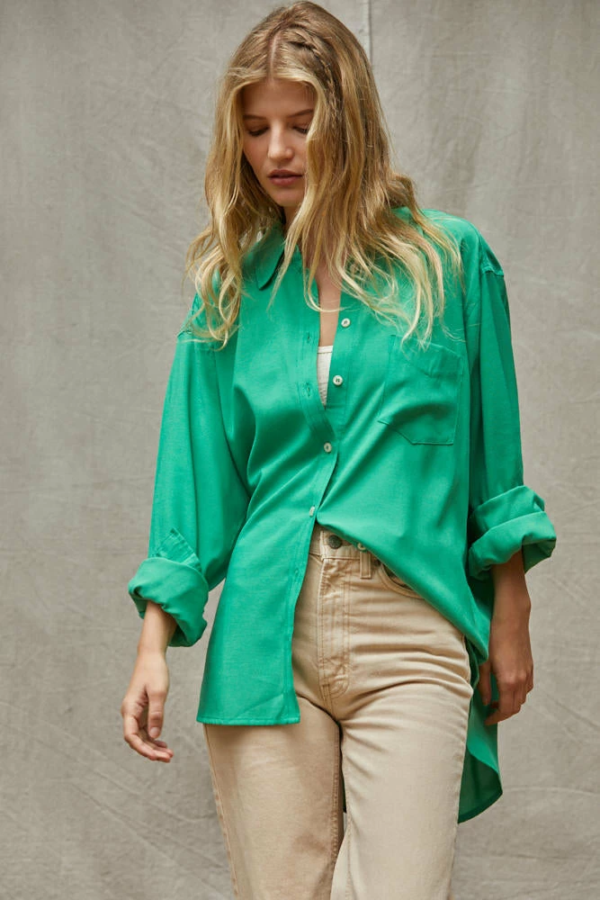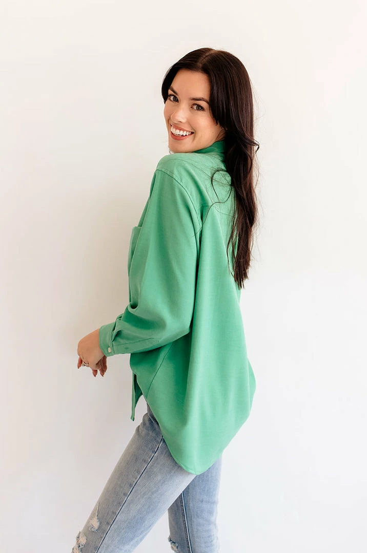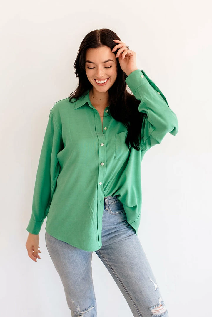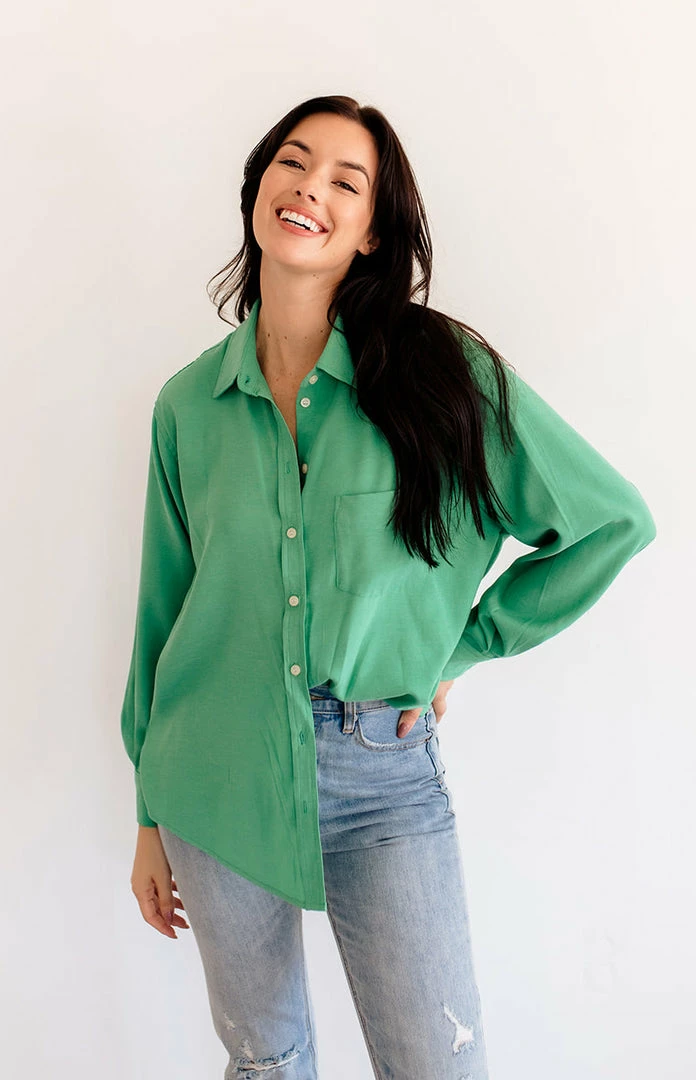 Add a pop of color to your Spring collection in the Good Luck Button Down Top in Kelly green that’s detailed with side pockets and a collar.