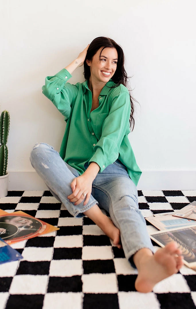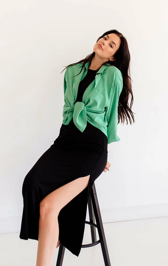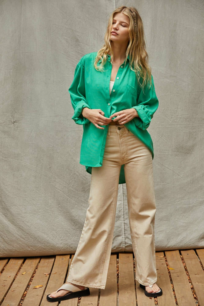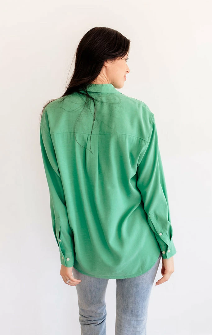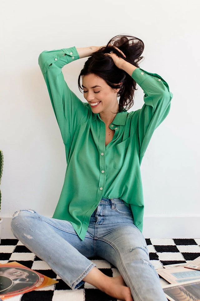 Add a pop of color to your Spring collection in the Good Luck Button Down Top in Kelly green that’s detailed with side pockets and a collar.