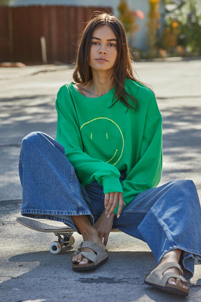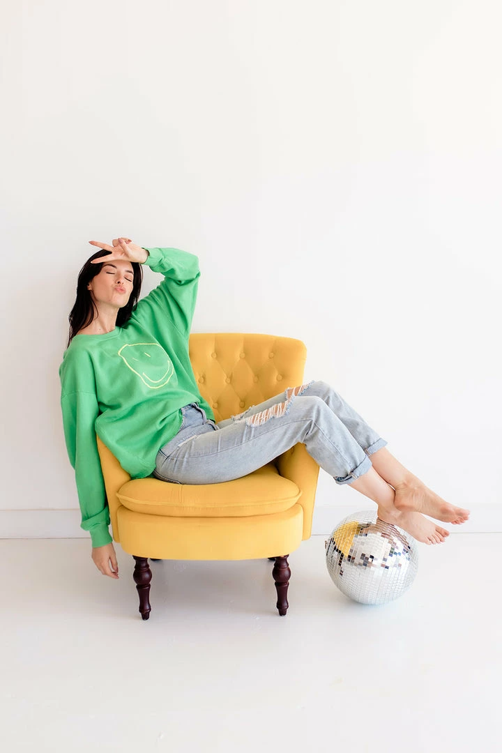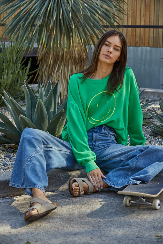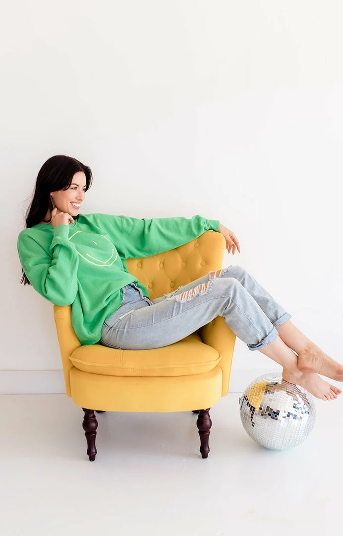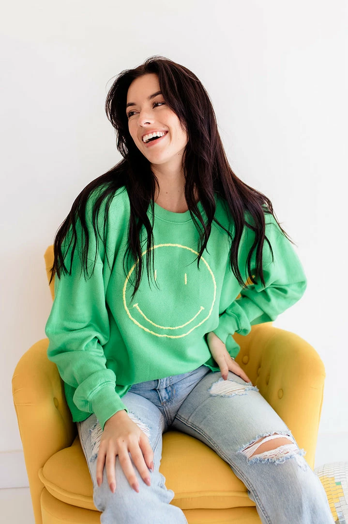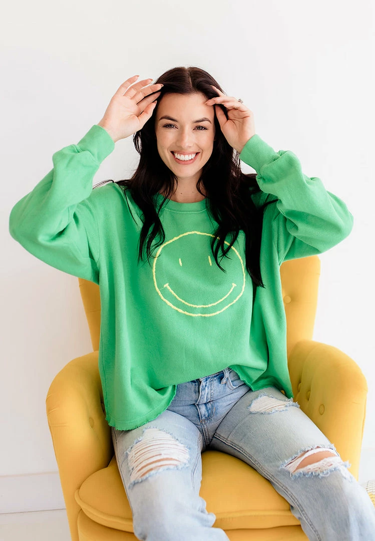 //BEST SELLER// It’s impossible not to be happy while wearing our Happy Day Smiley Face Pullover Sweater! A yellow embroidery smiley face graphic details this green pullover over sweater.