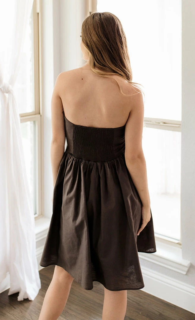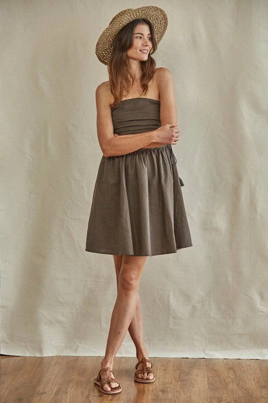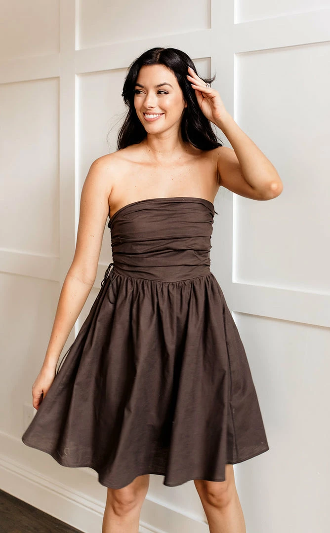 Spend nights under the Imelda Linen Blend Strapless Pleated Dress in a fudge brown hue. Finished with an adjustable ruched side details.