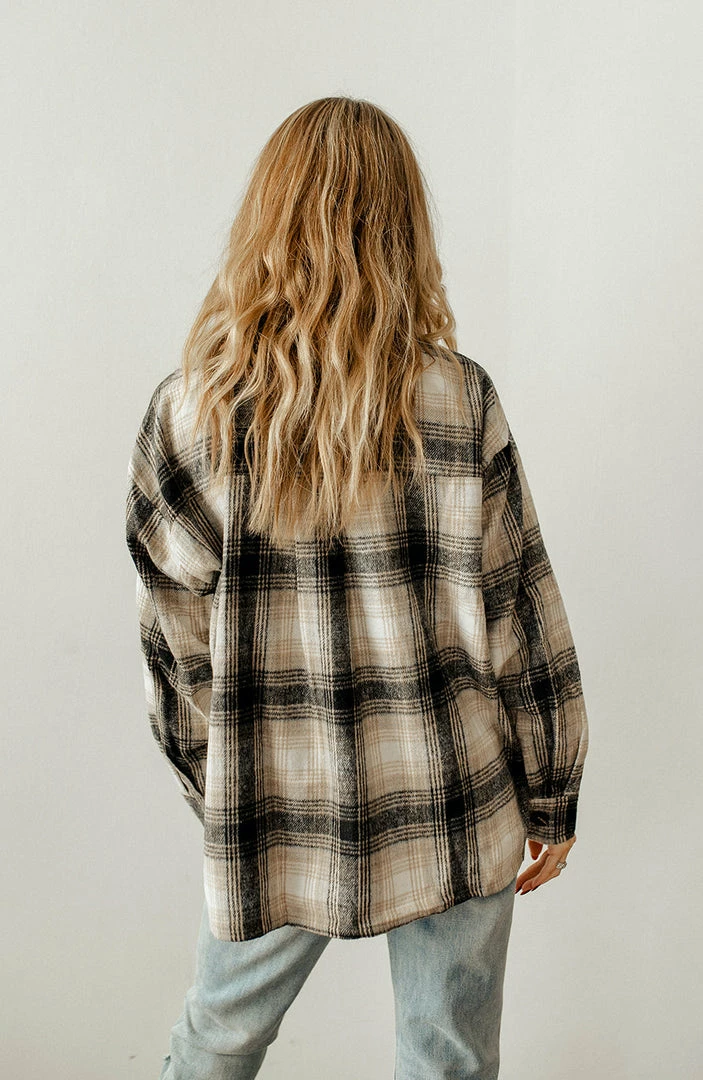 Not your classic flannel! The Jamie Cotton Plaid Button Down Top is a cool ivory, beige & black plaid with a collar. Finished with front button closures.