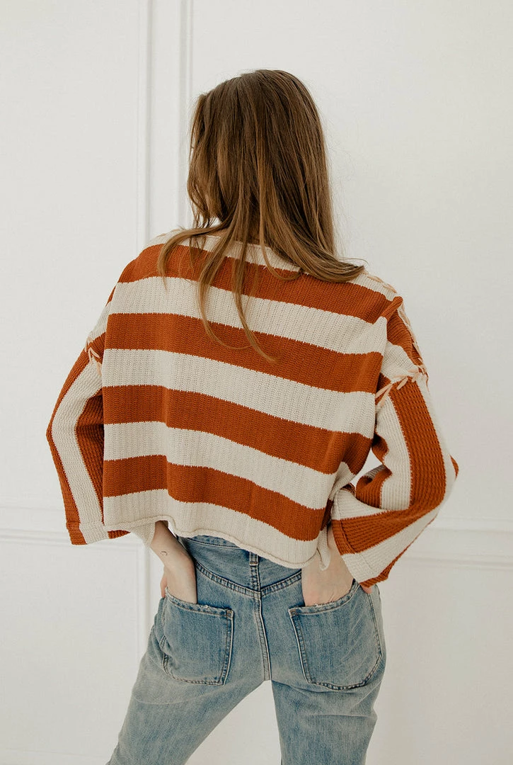 You can never have too many striped sweaters! Our Jamila Striped Knit Sweater features rust with pink lace up shoulder details. Designed with a wide neckline and long sleeves. A classic weekend look!
