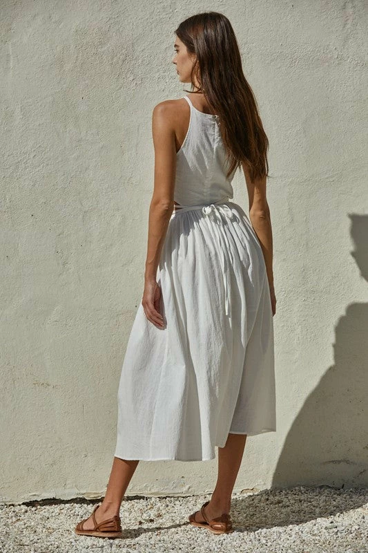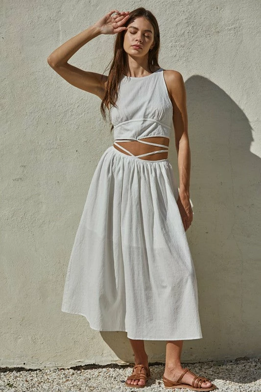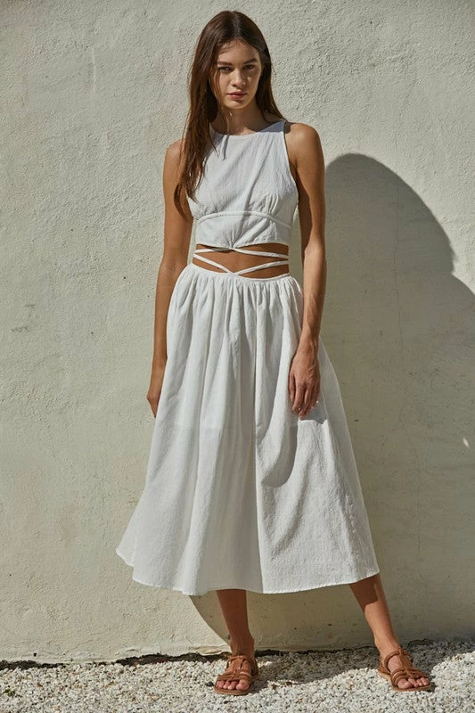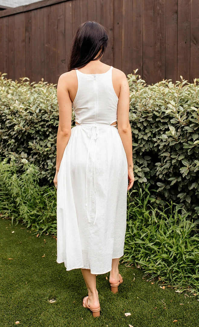 Picture yourself strolling through a beach town in the Katerina Cotton Cut Out Midi Dress in off white that’s detailed cutouts with a concealed back zipper closure.