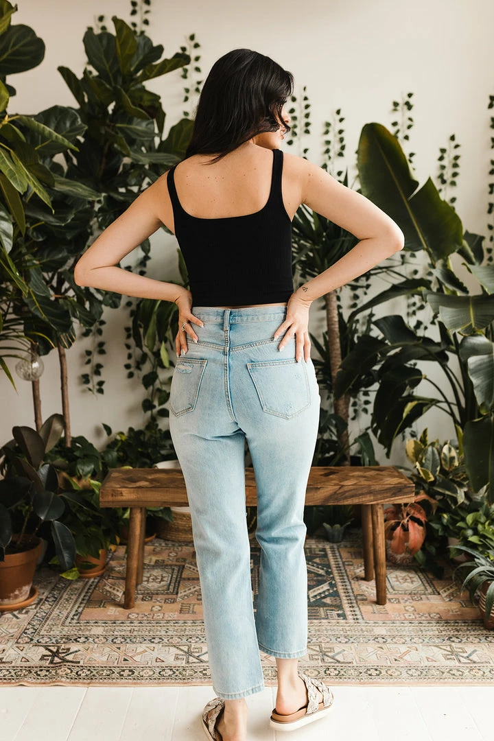 Our Kip High Rise Distressed Denim Jeans features a light wash with subtle fading and whiskering along the front. Constructed to fit high rise with a non-stretch, straight leg silhouette. Heavily distressed knees and hemlines detail the look with classic rugged style! Finished with five pockets and a front button and zipper closure.