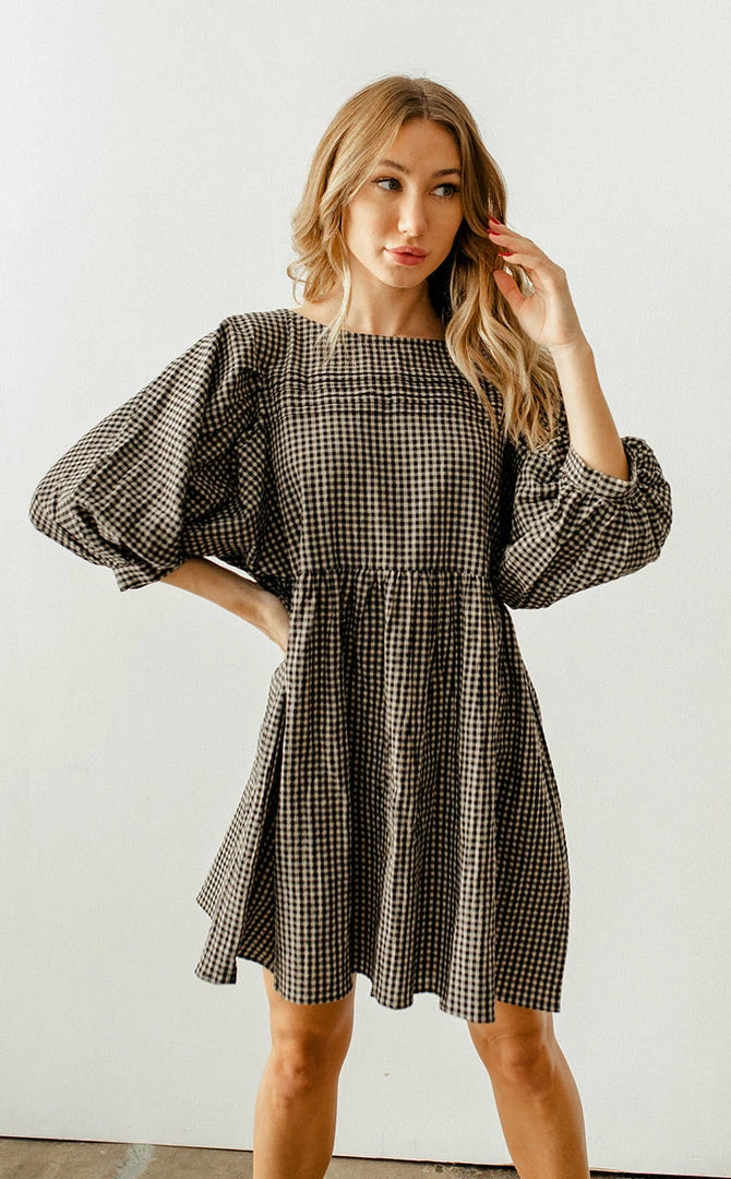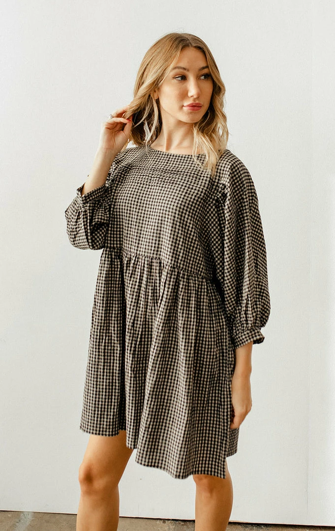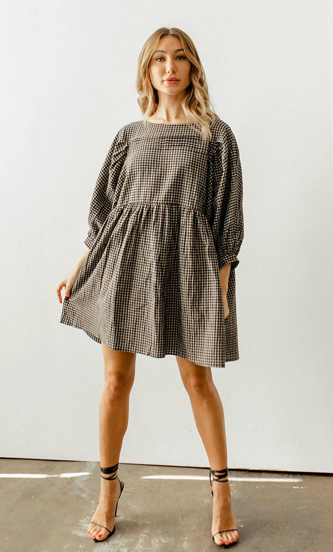 Revamp your office wardrobe in our Laila Gingham Babydoll Dress! This babydoll dress features black & taupe gingham print and a crew neckline. Designed with half sleeves and side pockets.