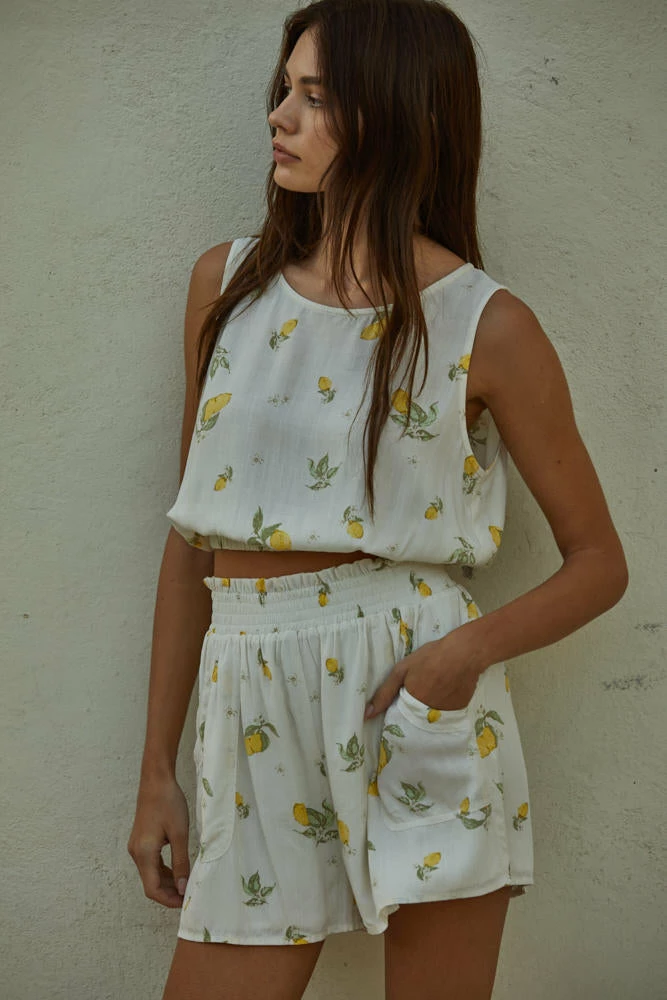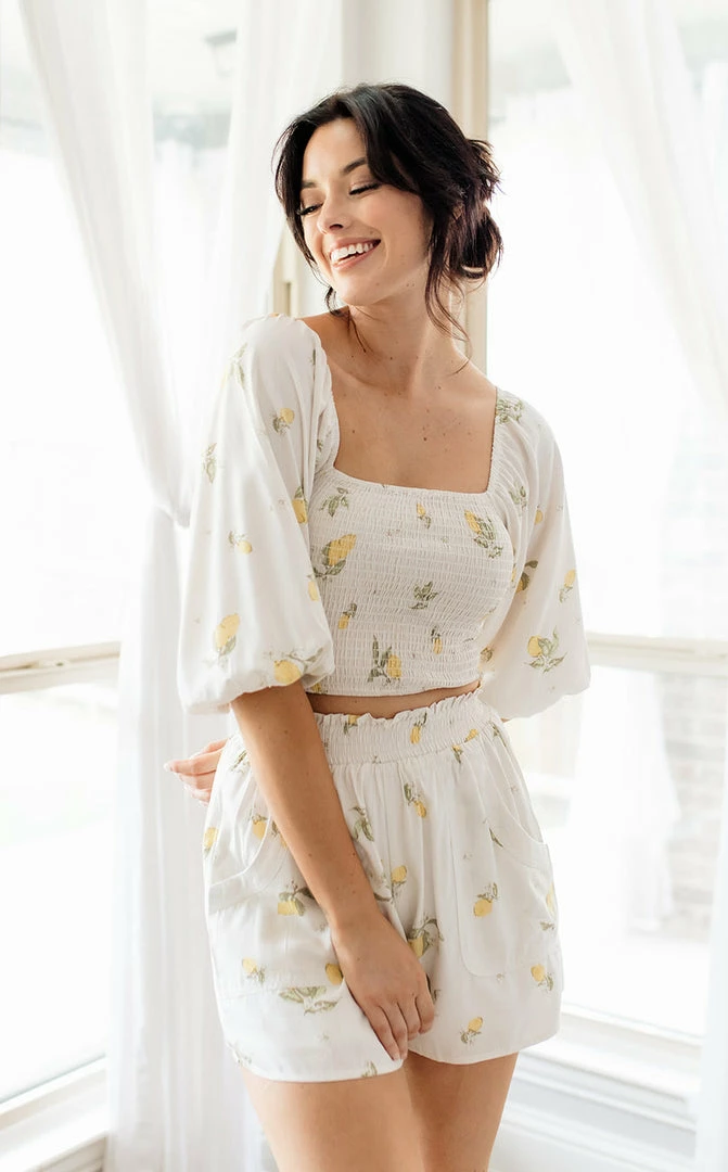This cotton set just screams summertime! Our Lemon Zest Linen High Rise Shorts look fabulous with the matching top and slide sandals. These ivory high rise shorts have an elastic smocked waist.