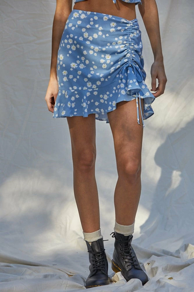 Bloom to your fullest babe! Our Like A Sunflower Ruched Ruffle Skirt is a sky blue base with florals in mustard, and white with a ruffled ruffle hem body. Styled with the Like A Sunflower Ruched Crop Top.