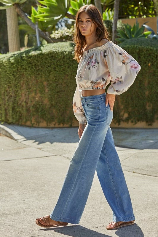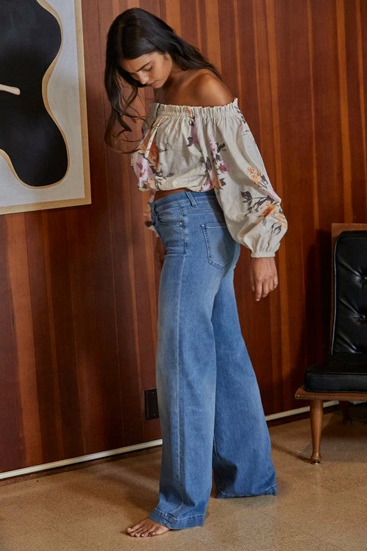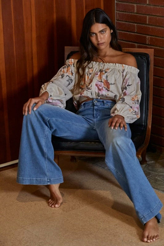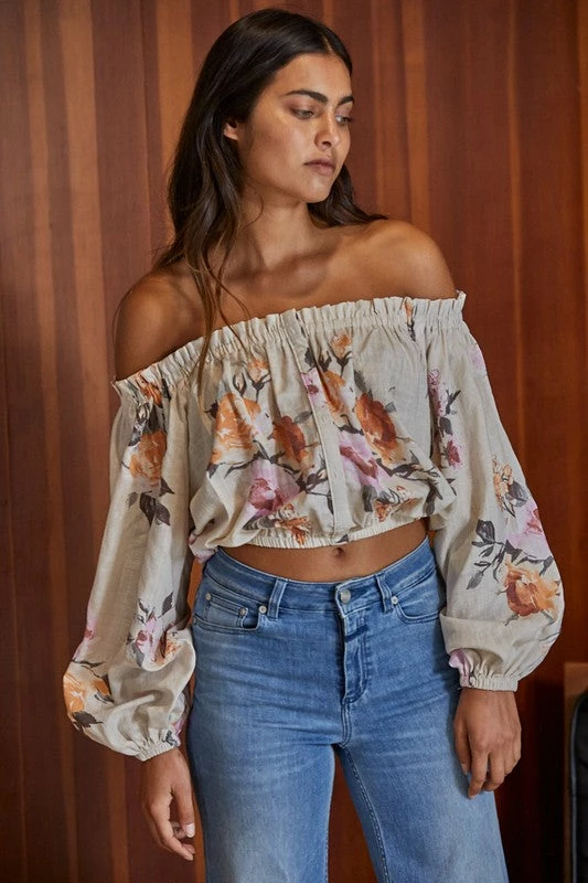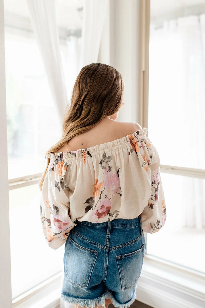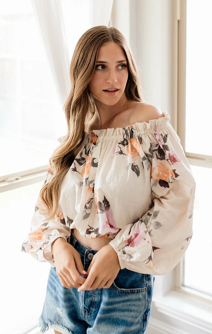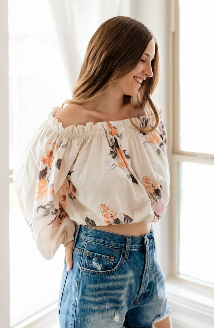 Go for a bold boho look in our Lyla Cotton Blend Floral Top! This off white floral top features hues of orange, rust, pink, mauve & dark olive on a ruffle off the shoulder neckline. Designed with long sleeves and elastic cuffs.