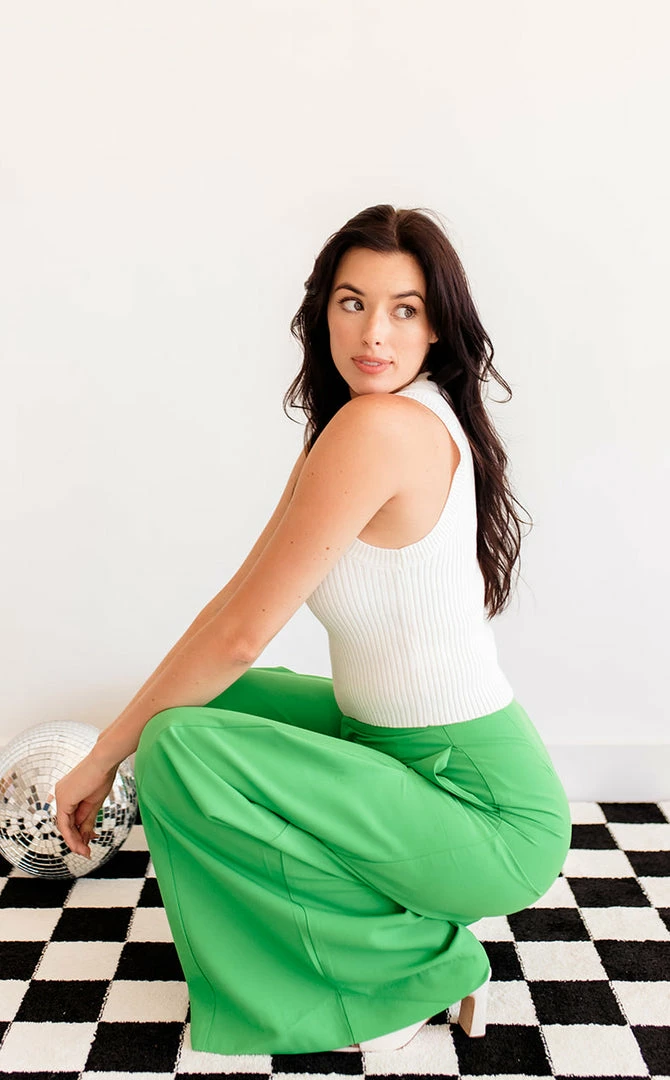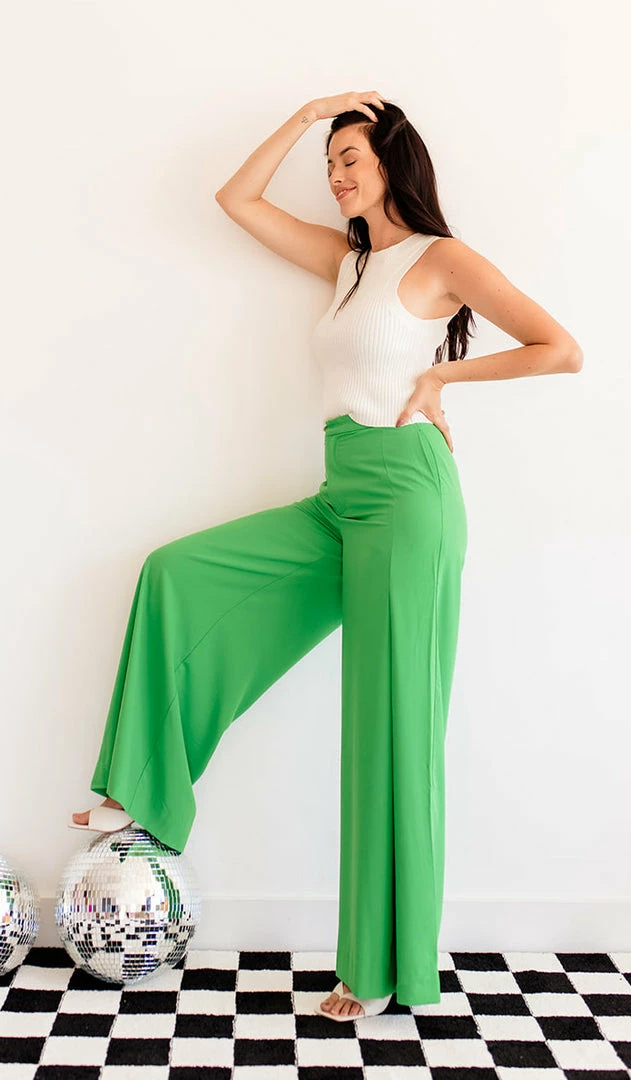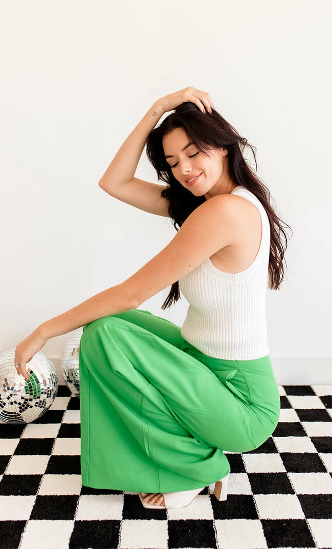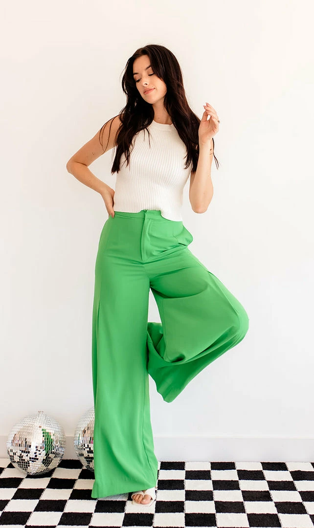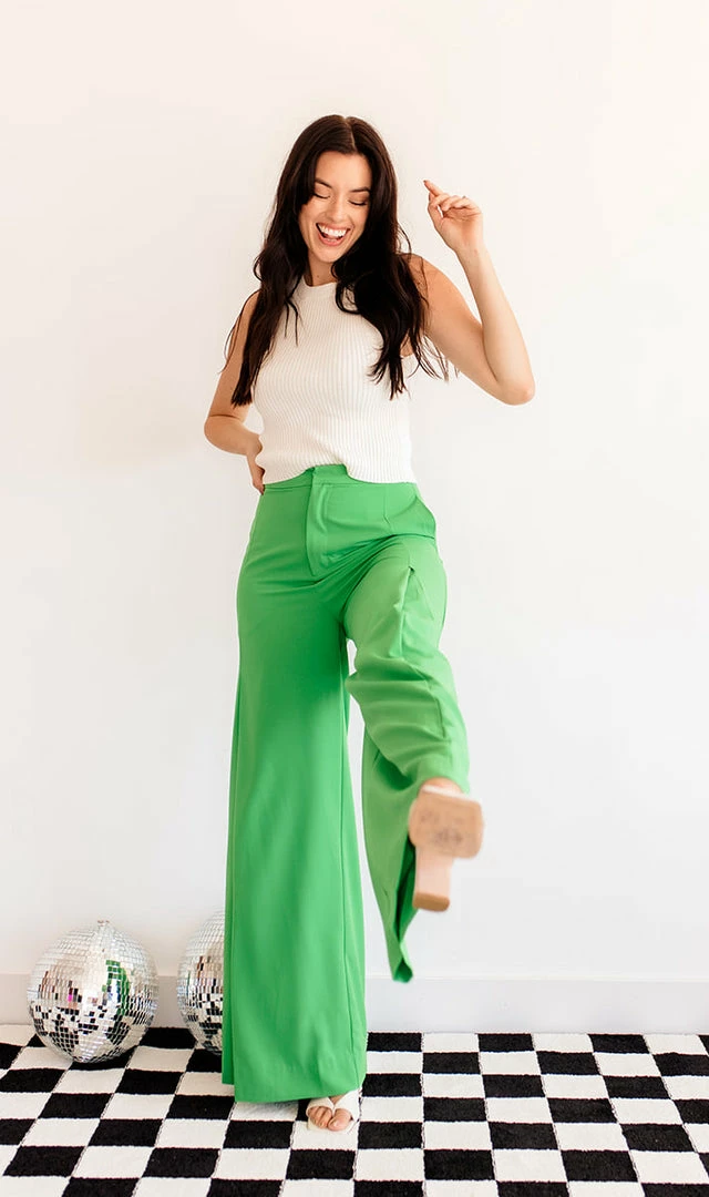 Best Seller// The trousers you never knew you needed until now! The Marleigh Wide Leg Trousers come in a luxurious kelly green fabrication with a structured waist, a high rise fit, and side pockets. Styled with our Piper Tank Top in White.