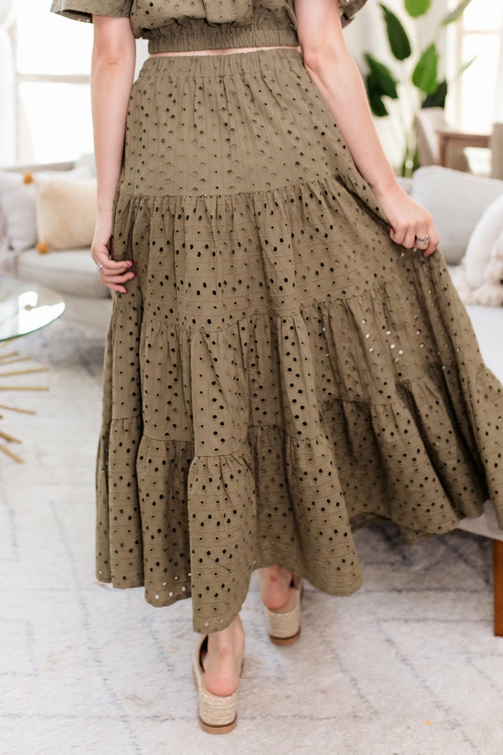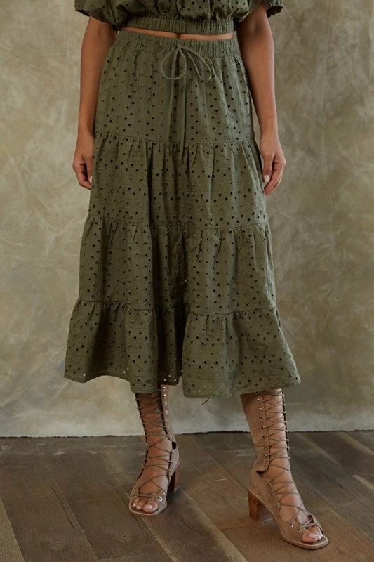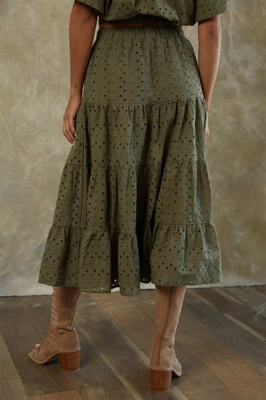 Look so sweet in the Mindy Cotton Eyelet Tiered Midi Skirt in olive that’s detailed with an elastic waistband. Styled with our Mindy Cotton Eyelet Crop Top.