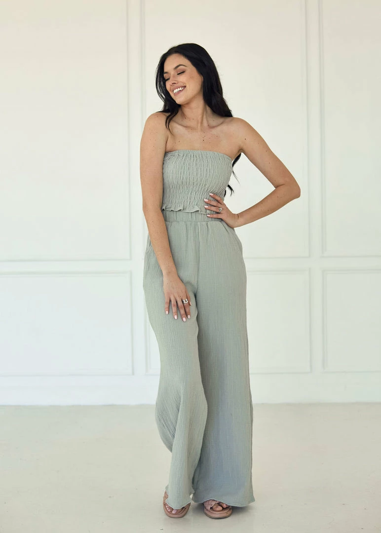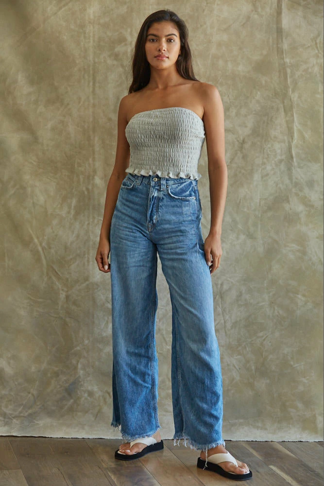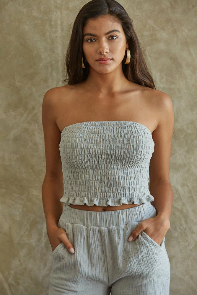 A linen cotton blend set just screams vacation vibes! Our Teri Cotton Smocked Tube Top looks iconic paired with the matching pants and strappy sandals. This dusty blue colored fitted top has a smocked body and a strapless neckline.
