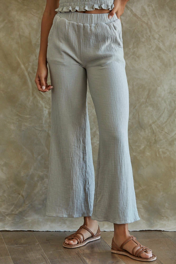 Take it easy on the weekend in our Teri Cotton Wide Leg Pocketed Pants! These dusty blue cotton pants are secured with a high rise elastic waistband. Finished with side pockets. Pair with our matching Teri Cotton Smocked Tube Top for an effortless look!