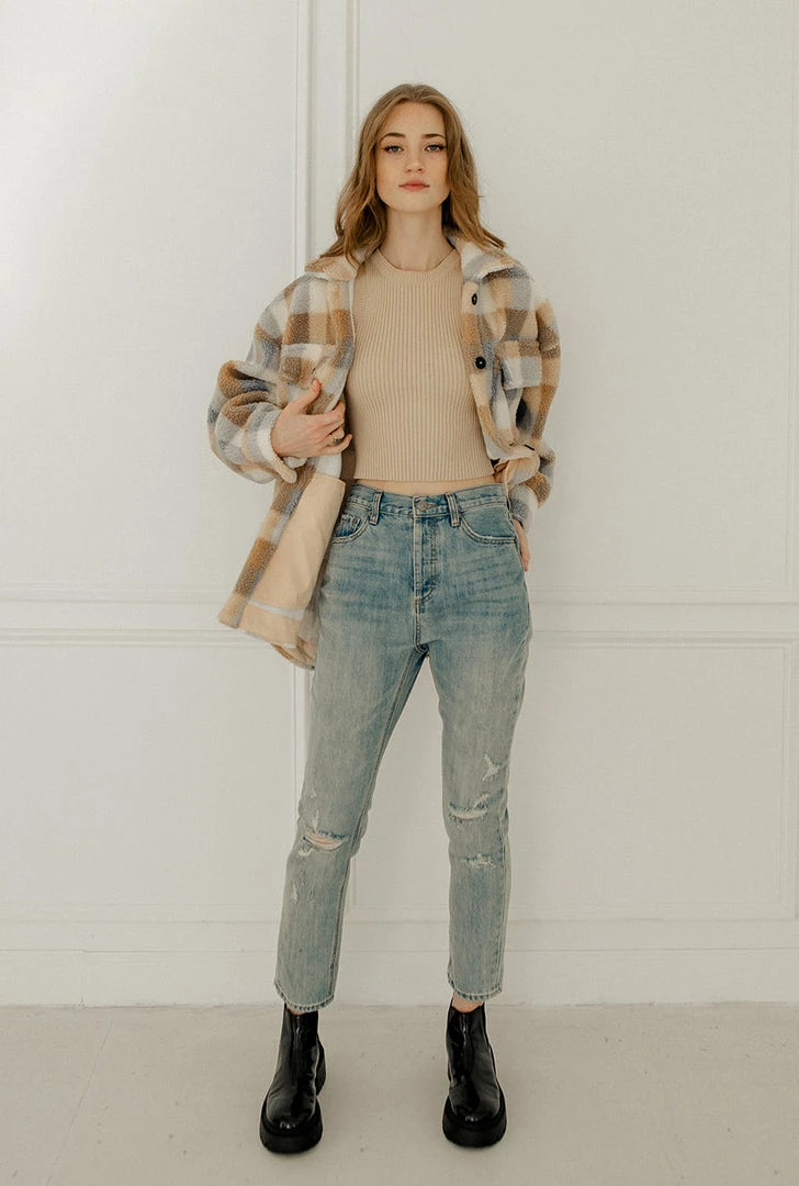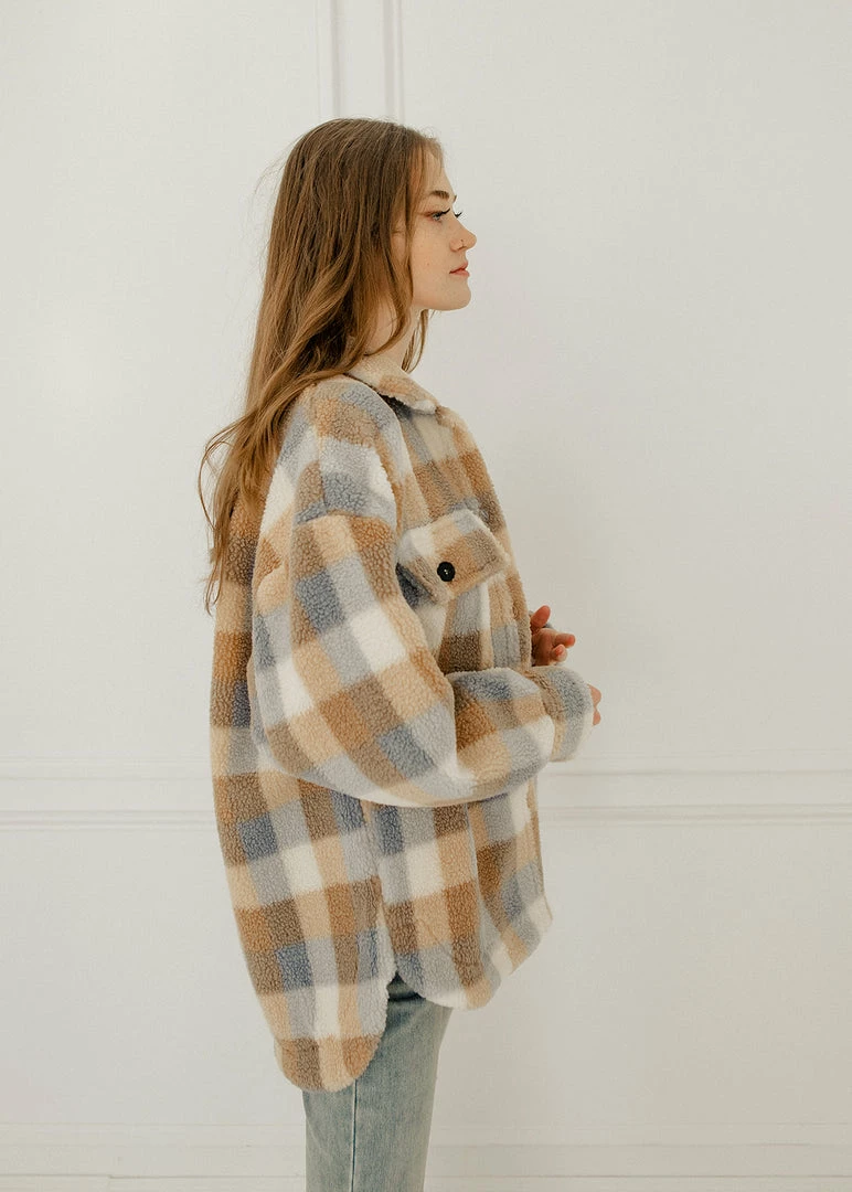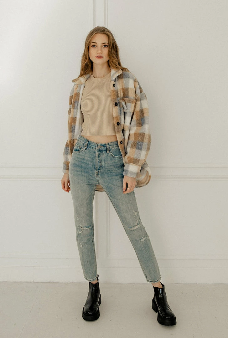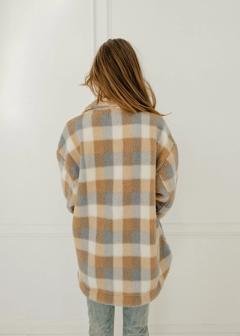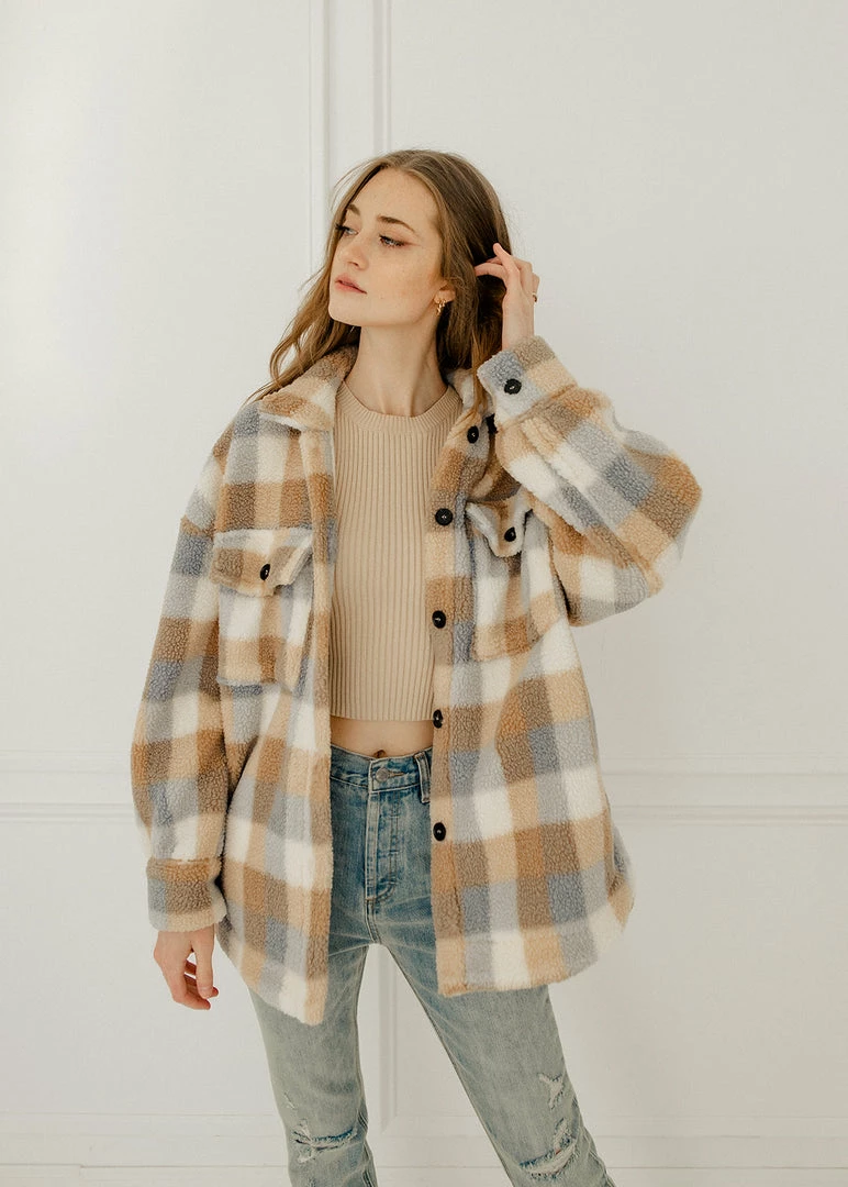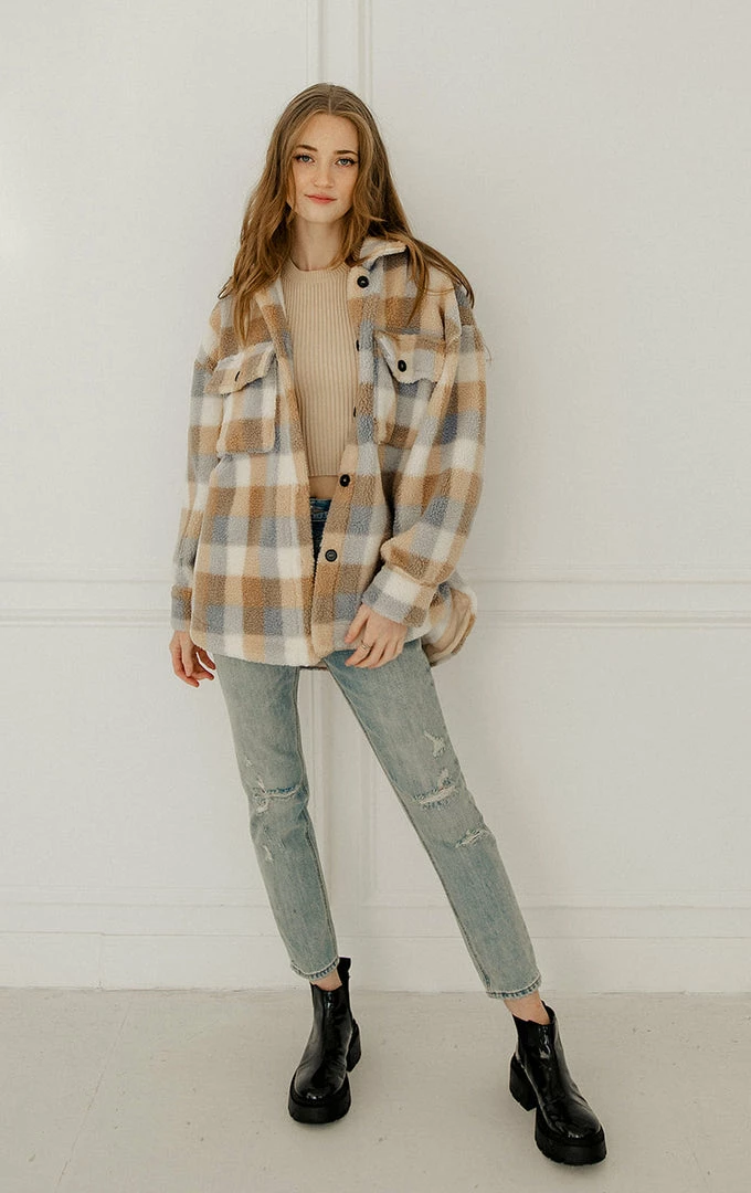 Get your hands on our new shacket! Our Maybrooke Plaid Wool Blend Jacket mixes taupe, sky blue & cream plaids. Designed with a collar and bust pockets & side pockets. Finished with front button closures.