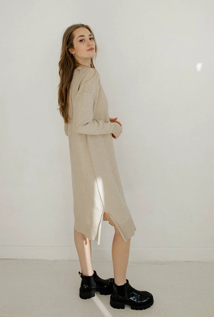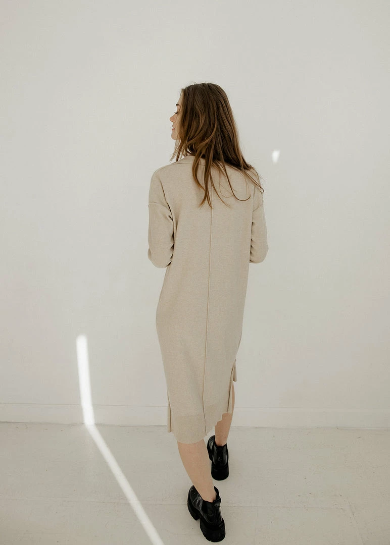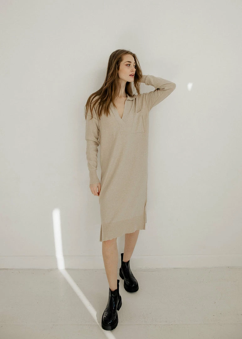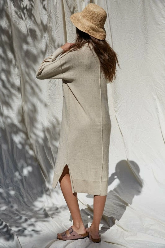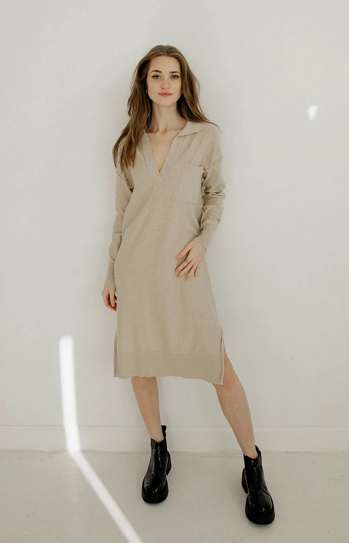 From work to weekend, our Milano Collared Neck Knit Midi Dress does it all! This beige dress has a collar and a split neckline. A 4” front slit adorns the front of this beauty. Finished with a split neckline.