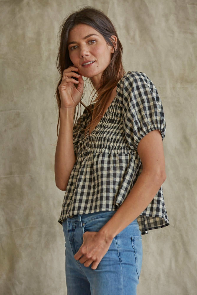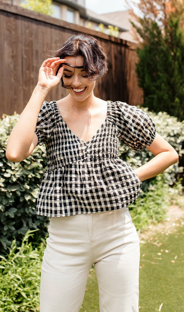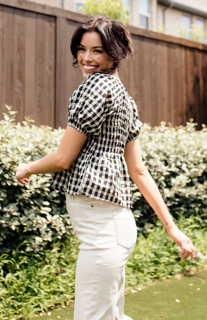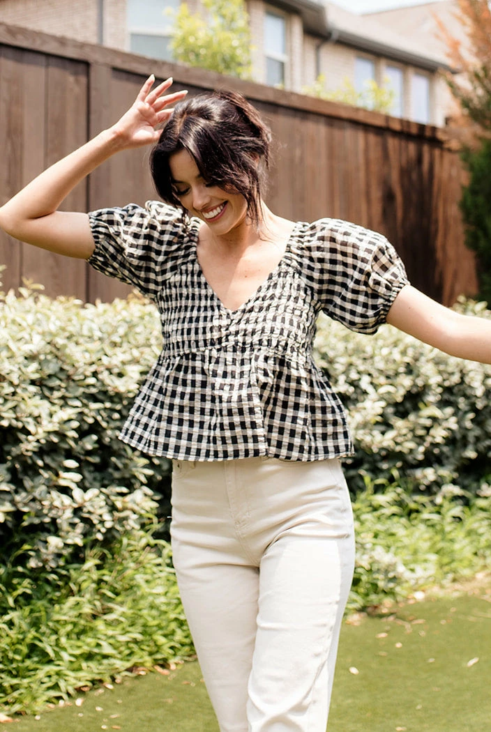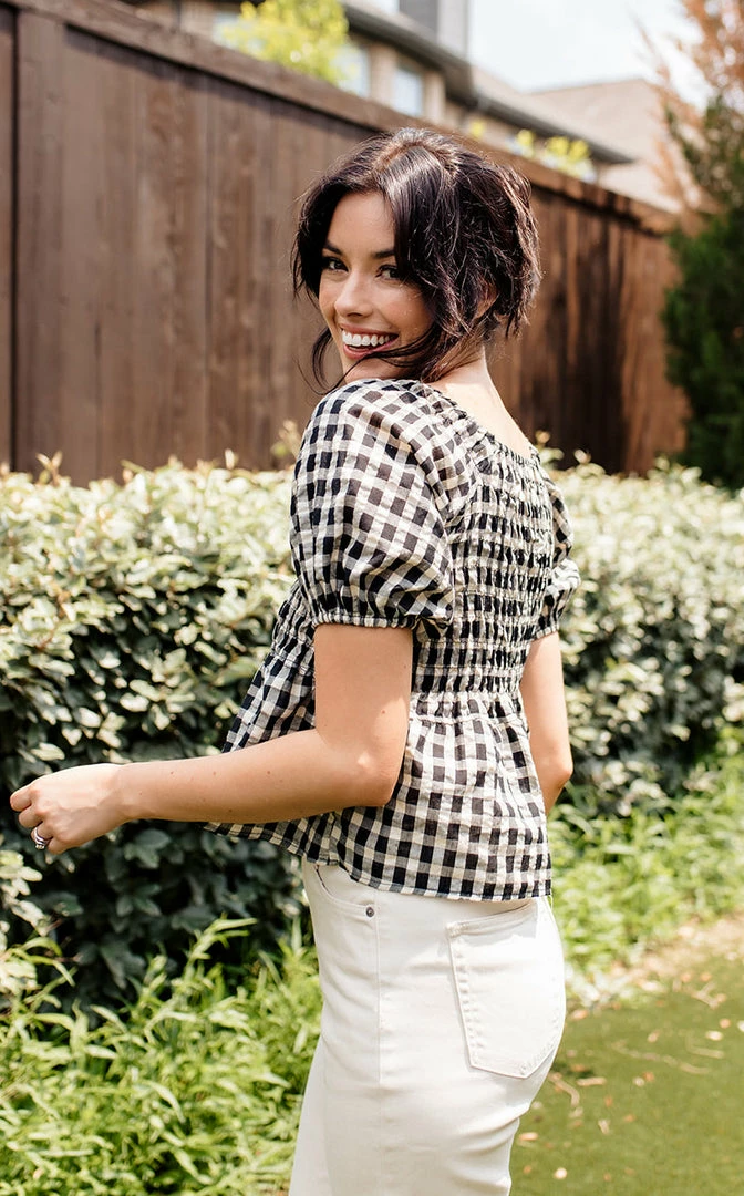 Our Mirabel Gingham Smocked Top is the most gorgeous summer top! This black & cream gingham top features a v-neckline and puff sleeves. The fit and flare silhouette looks fab paired with denim.