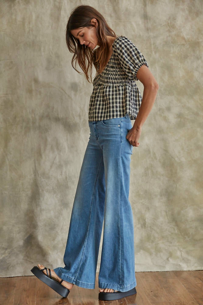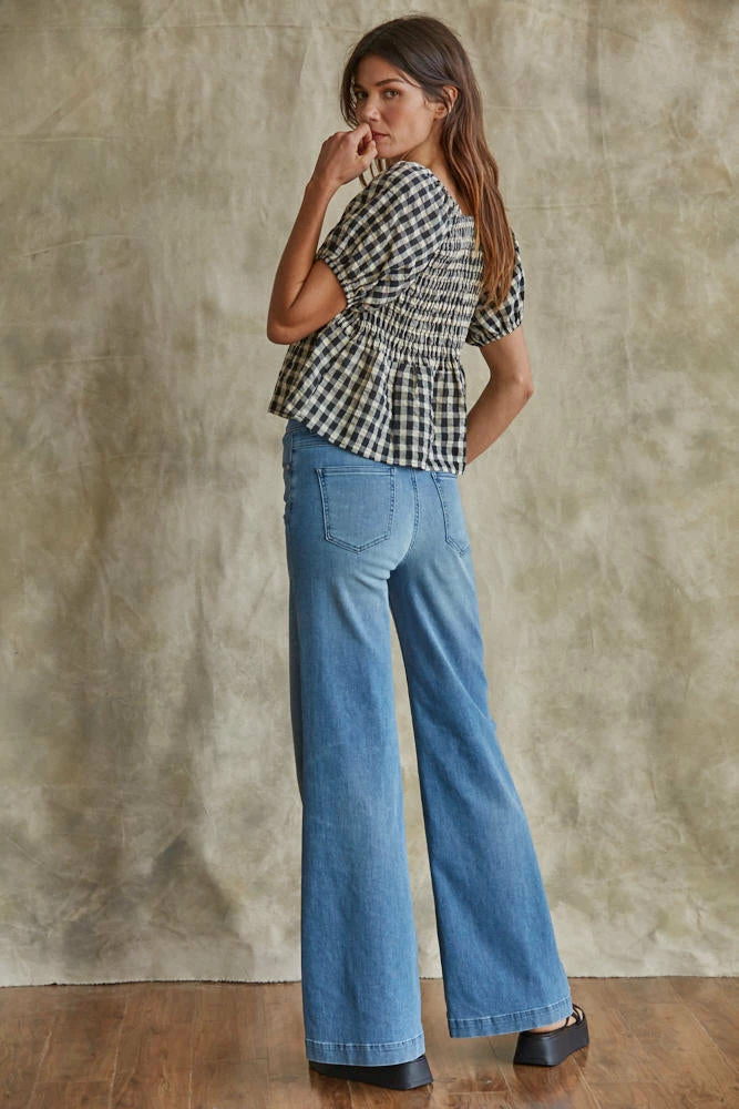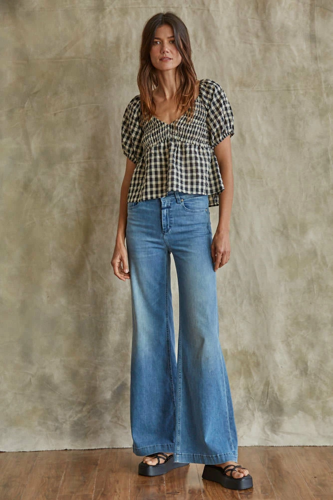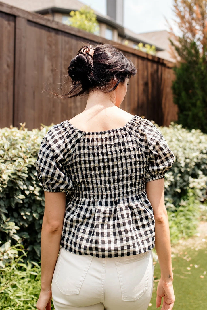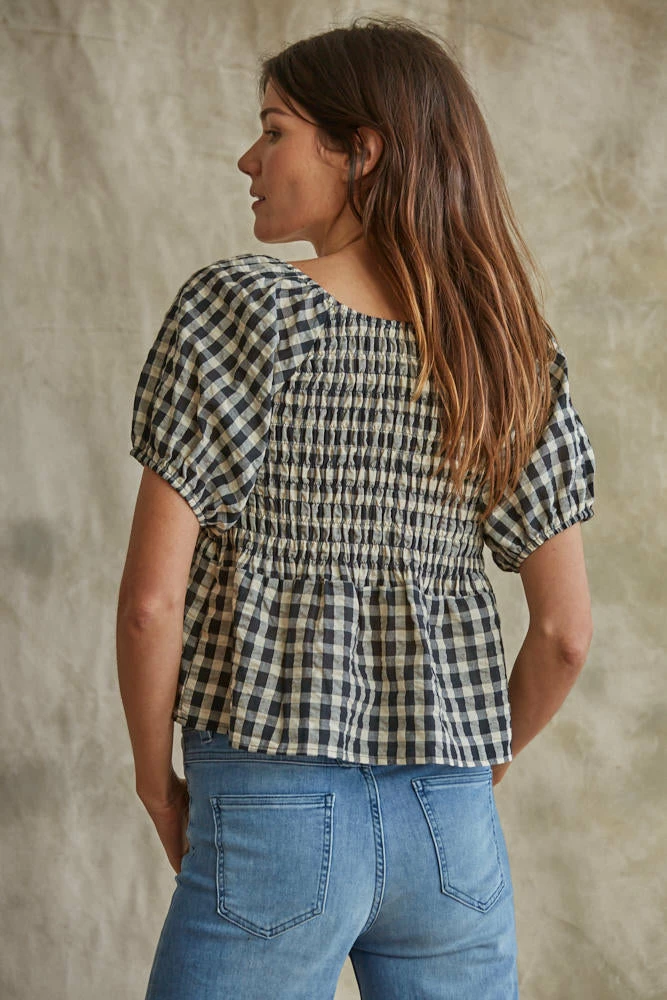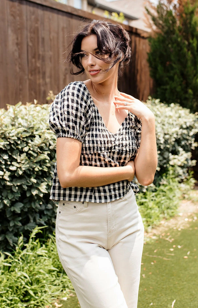 Our Mirabel Gingham Smocked Top is the most gorgeous summer top! This black & cream gingham top features a v-neckline and puff sleeves. The fit and flare silhouette looks fab paired with denim.