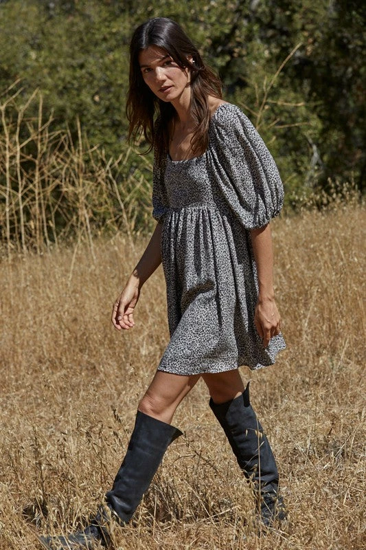 We love a puff sleeve babydoll dress! Our Murphy Leopard Puff Sleeve Babydoll Dress is the essence of spring with its charcoal base and leopard print throughout. This square neck dress has a tiered body and a back tie closure.